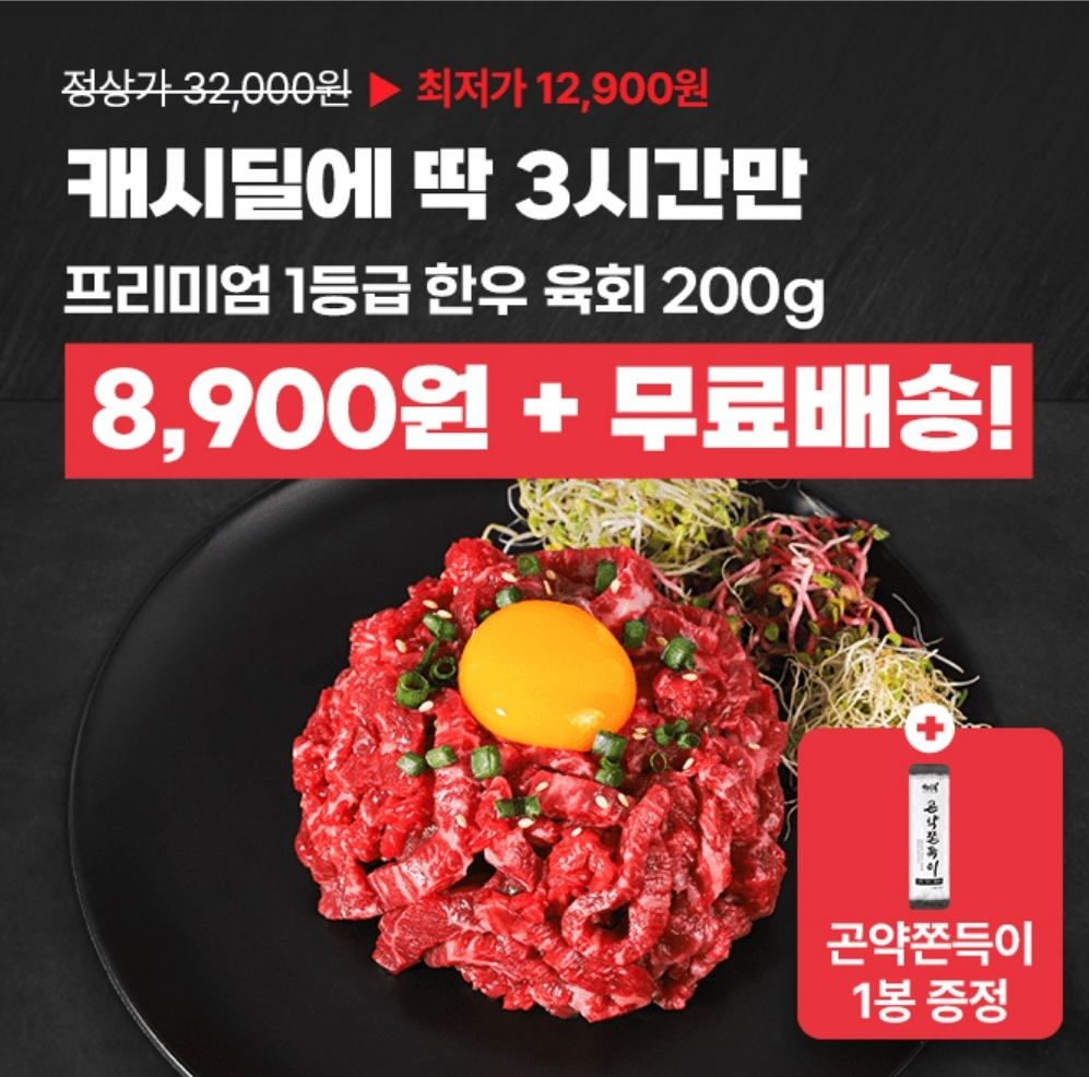 3시간 동안 진행되는 "캐시딜" 타임특가에서 까칠한박여사 프리미엄 1등급 한우 육회 200g+곤약쫀득이 증정이 역대급 할인 8,900원+무료배송으로 진행됩니다.