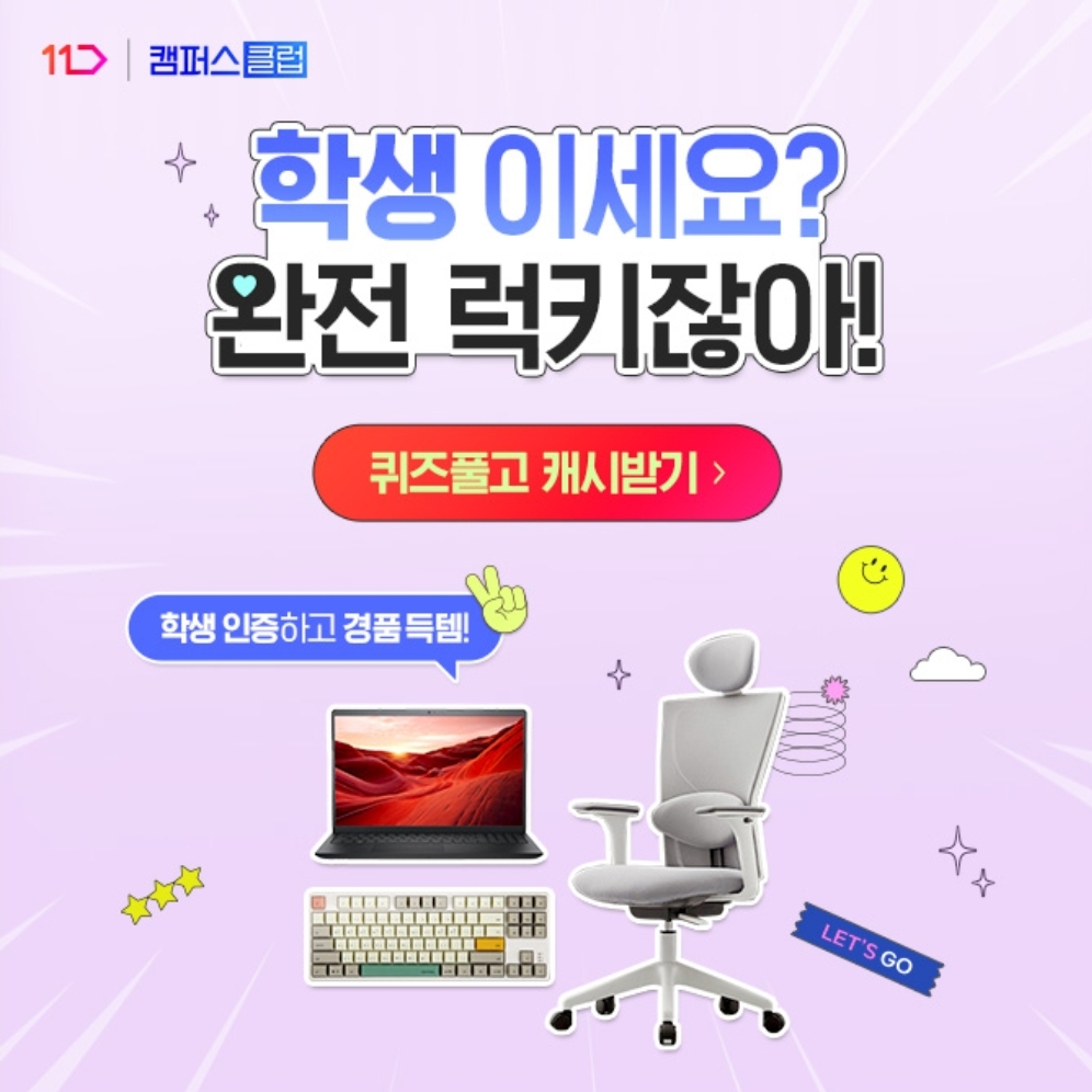 가을 새 학기를 맞아 00된 학생만을 위한 비 밀 특가몰, 캠퍼스 클럽이 역대급 경품 찬스를 준비했어요! 대학생, 고등학생 00 시 전 상품을 할인가로 만날 수 있어요! 간단하게 학생 00하러 가볼 까요? 00에 들어갈 단어는 무엇일까요?