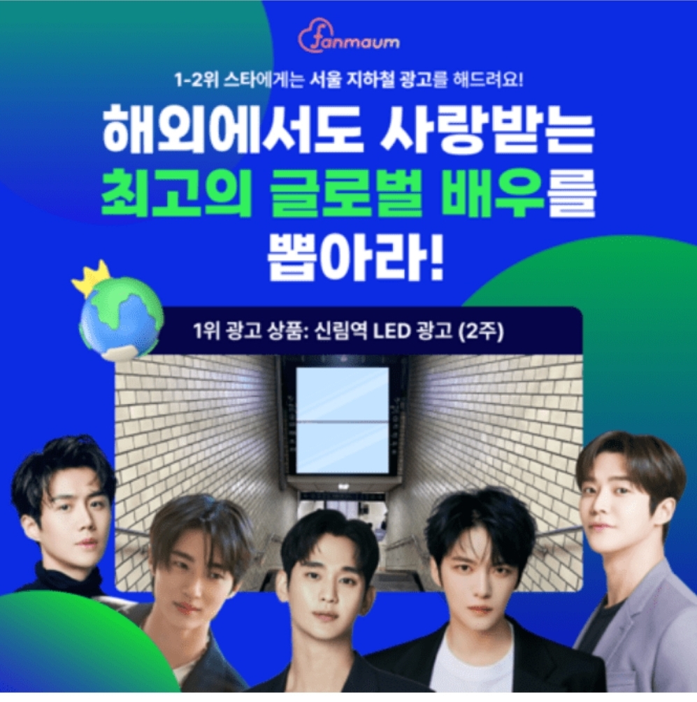 팬마음 글로벌 배우 투표에서 1위를 달성한 스타에게는 일일 유동인구가 10만 명인 00역에 계단 천장 광고를 2주간 해드려요!