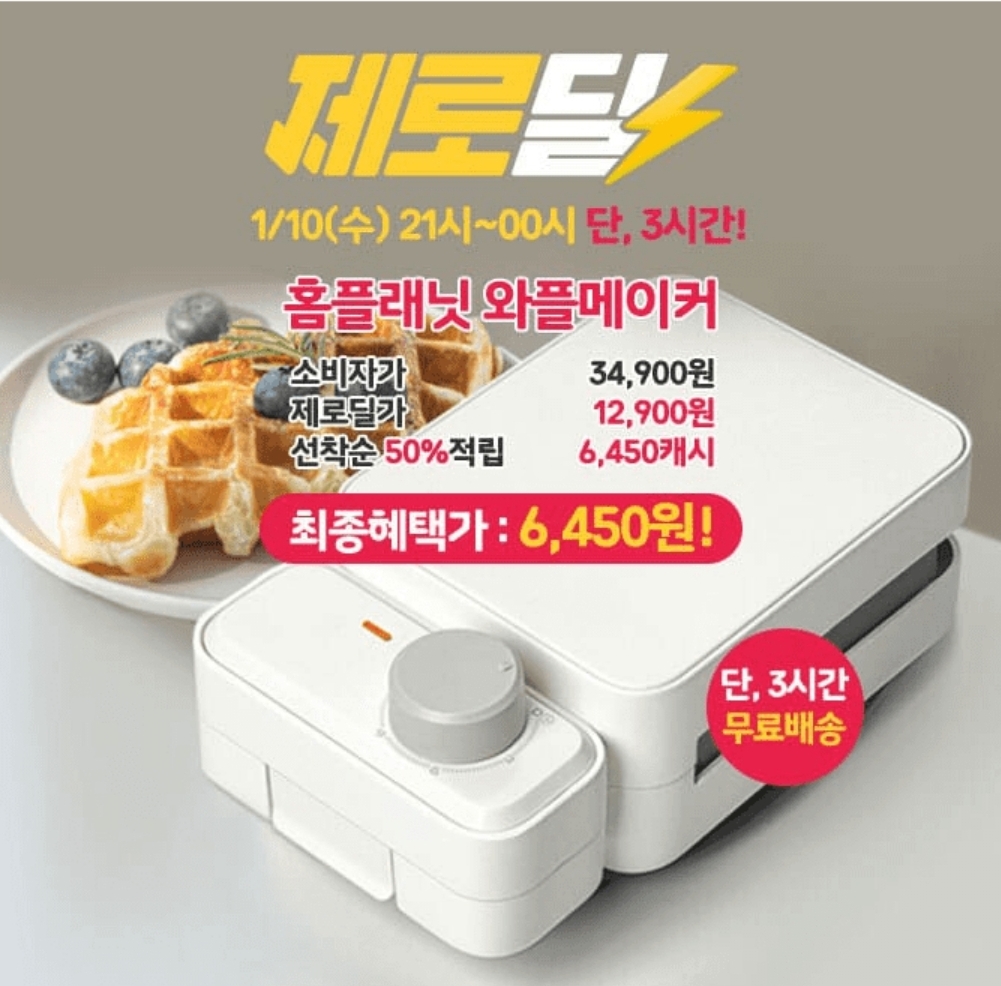 3시간 동안 진행되는 "제로딜" 타임특가에서는 "홈플래닛 타이머 와플 샌드위치 메이커"가 12,900원 무료배송 00% 할인으로 진행하고 50%캐시적립금(6,450캐시)을 드립니다. 빈 칸에 들어갈 숫자는 무엇일까요?