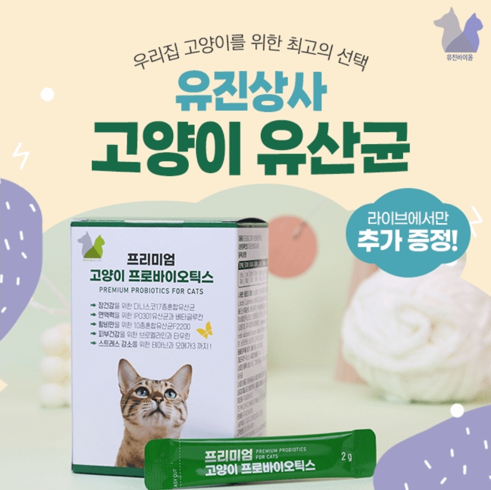 유진바이옴의 프리바오틱스는 고양이 장건강부터 항비만까지 챙겨줄 수 있는 ㅇㅇ의 선택이 될 것입니다. 라이브 중 스틱 추가 증정 예정입니다.