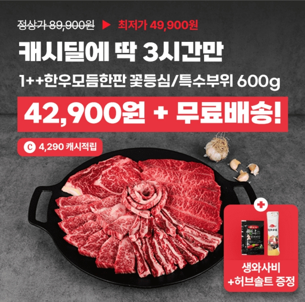 3시간 동안 진행되는 "캐시딜" 타임특가에서 까칠한 박여사 1++ 한우모듬한판 꽃등심 300g+특수부위 300g+와사비/허브솔트 증정이 역대급 할인 42900원+무료배송으로 진행됩니다.  까박 1++한우 특수부위는 선호도 높은 살치살+갈비살+ㅇㅇ살+업진살로 구성되어 더욱 맛있게 즐길 수 있다고 합니다. 이 빈칸에 들어갈 글자는 무엇일까요?(히트 ; ㅂㅊ)