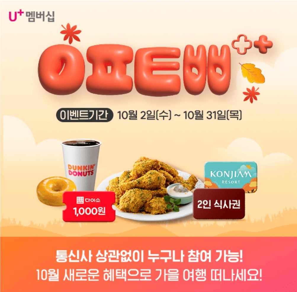 10월 식도락 여행과 챌린지 이벤트 참여하면 곤지암 리조트 숙박권, 뿌링클 세트, 던킨세트 등 유플러스의 다양한 혜택이 준비되어 있습니다 통신사 상관없이 누구나 간단하게 검색만 해도 경품을 받을 수 있는 이 혜택은 무엇일까요? (힌트: ㅇㅍㅌㅍ)