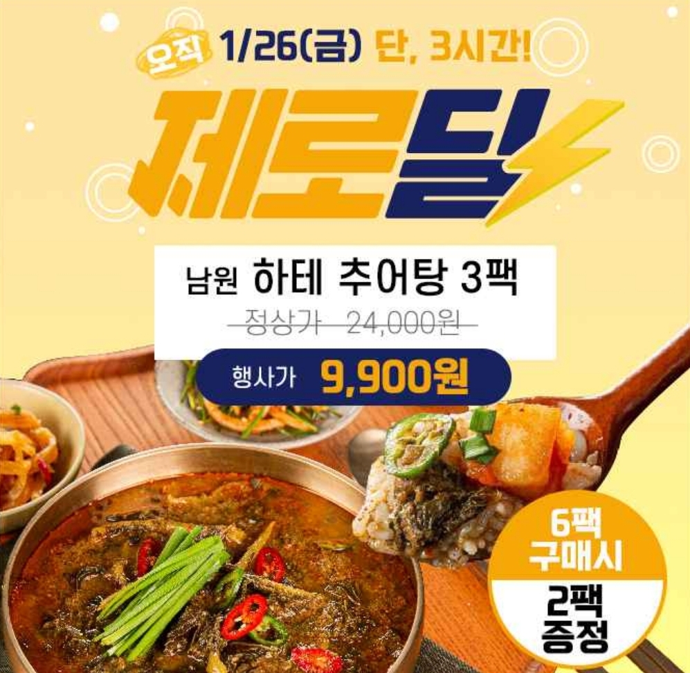 3시간 동안 진행되는 "캐시딜' 타임특가에서 100% 국내산! 남원 하테 추어탕 500g 3팩이 역대급 할인 9900원+무료배송으로 진행됩니다.