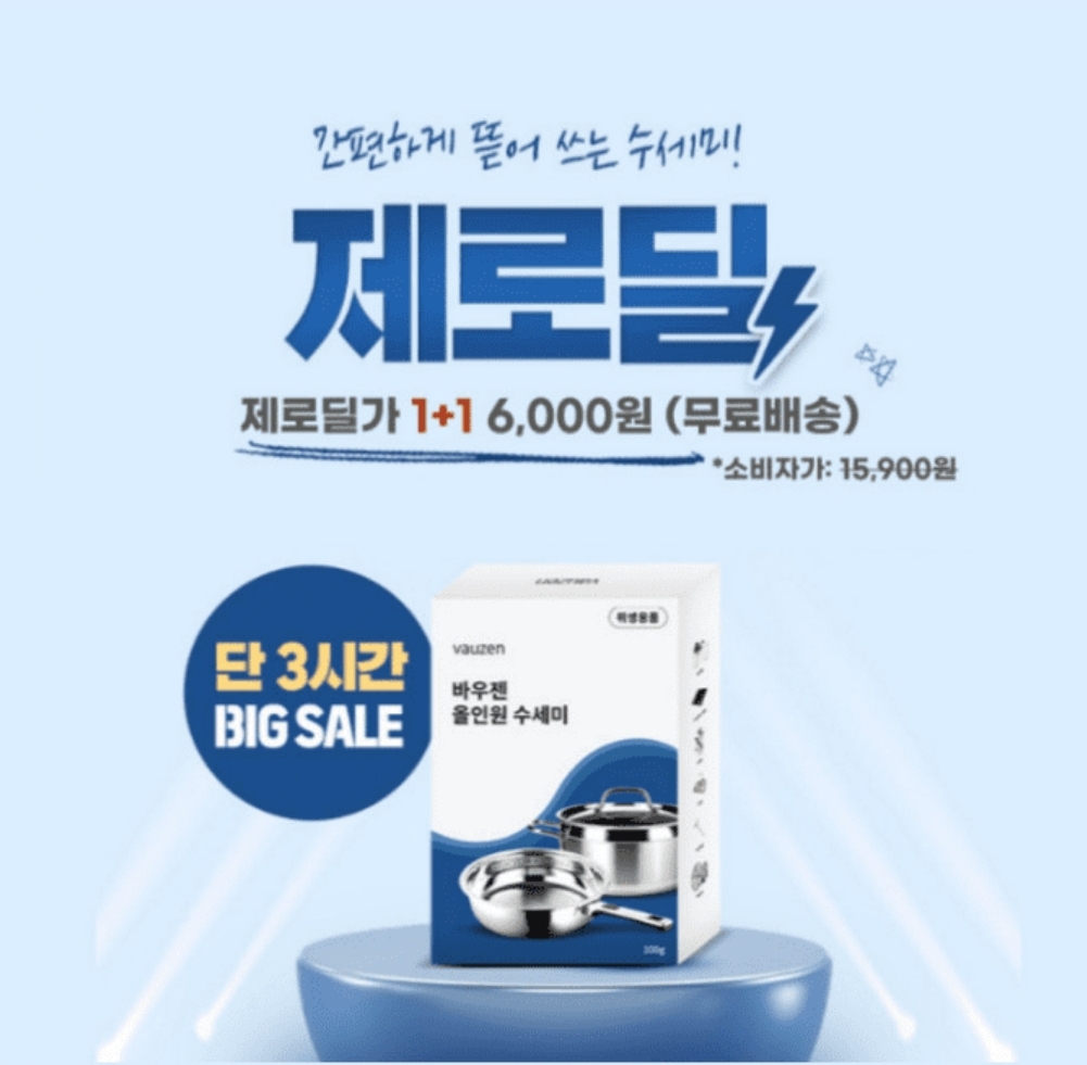 3시간 동안 진행되는 '제로딜' 타임특가에서 1+1 바우젠 올인원 뜯어쓰는 일회용 수세미 1팩(50g*2p) +1팩(50g*2P)이 6,000원 무료배송 00% 할인으로 진행됩니다. 빈 칸에 들어갈 숫자는 무엇일까요?