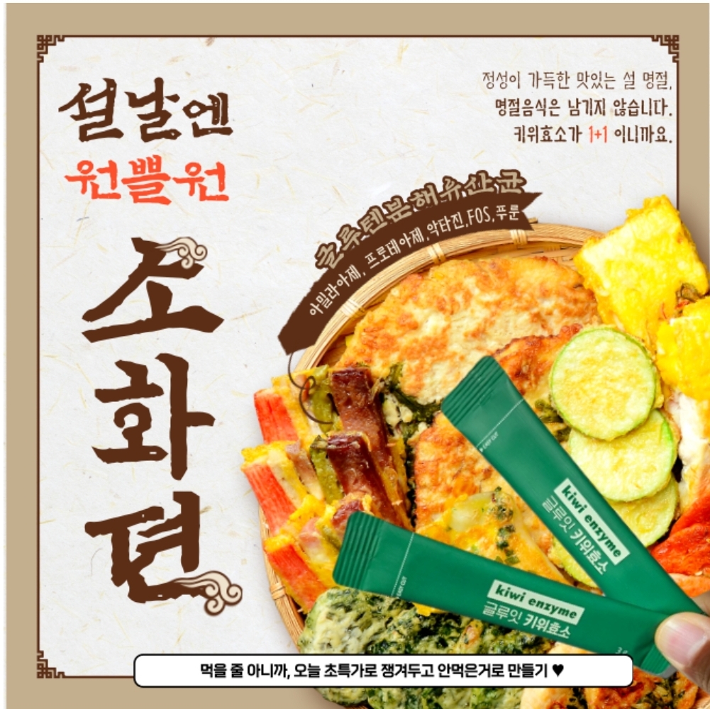 설에 먹은 맛있는 전,면,빵,밀가루 음식을 맘껏 먹을 수 있게 만들어진 효소로 뉴질랜드의 글로벌브랜드 ㅇㅇㅇㅇ의 원료가 들어간 글루잇 키위효소는 키위 껍질 알러지지가 있는 분도 먹을 수 있게 과육만 사용한 원료로 만들어였습니다. ㅇㅇㅇㅇ는 어디 브랜드일까요?