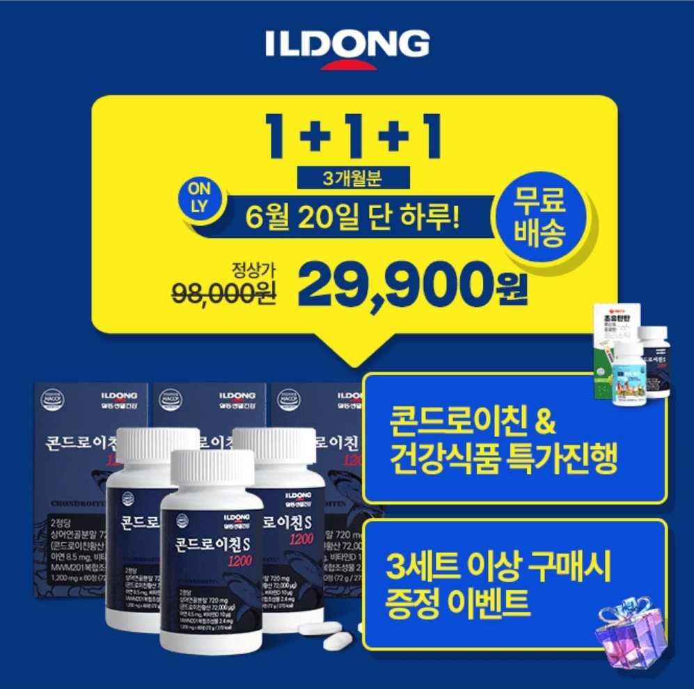 1+1+ 1 관절엔 일동 콘드로이친S 1200mg*60정(총120정)이 소비자가 98,000원 특가 00000원 무료배송 69% 할인으로 진행됩니다. 빈 칸에 들어갈 숫자는 무엇일까요?