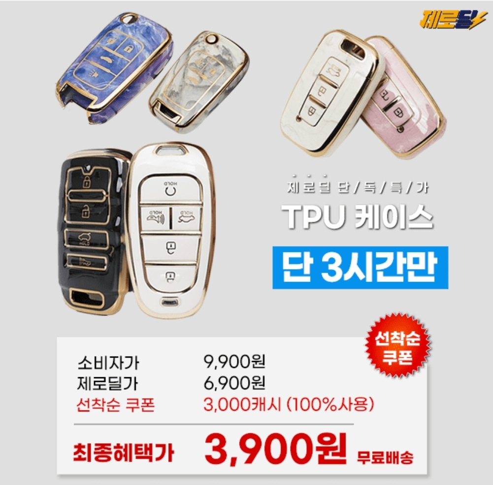 3시간 동안 진행되는 "제로딜" 타임특가에서 "바이어블 차량용 대리석 TPU 스마트키 폴딩키 풀커버 키케이스"가 6,900원 무료배송 ㅇㅇ%할인으로 진행됩니다. 빈 칸에 들어갈 숫자는 무엇일까요?(힌트 : 숫자)