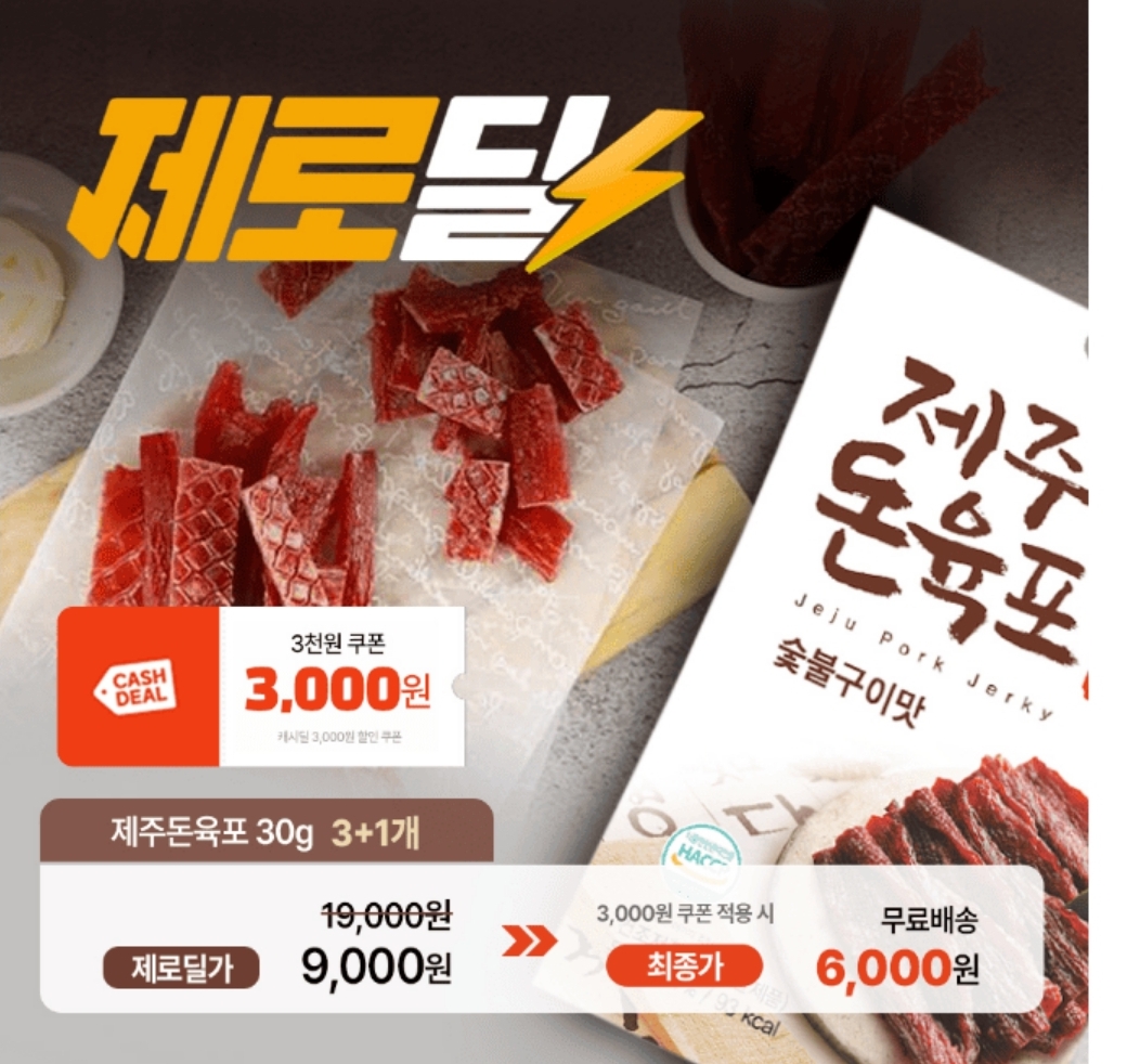 3시간 동안 진행되는 "제로딜" 타임특가에서 "3+1 제철진미 숯불구이맛 등심육포40g"가 소비자가 19,000원 제로딜가 ㅇㅇㅇㅇ원 무료배송 53% 할인으로 진행됩니다. 빈 칸에 들어갈 숫자는 무엇일까요?