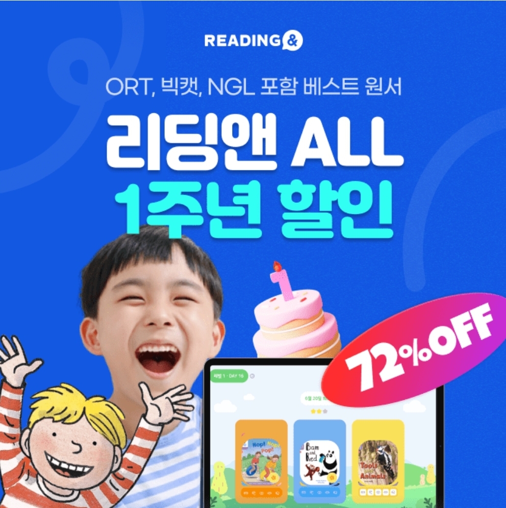 암기와 시험공부로 배울 수 없는 '진짜 영어 감'을 깨워주는 <리딩앤 ALL>! 론칭 1주년을 맞아 ORT가 포함된 <리딩앤 ALL>을 72% 파 격 할인가로 시작할 수 있어요. 7월에 일단 시 작해야 이득인 <리딩앤 ALL 1주년 이벤트, 0000>! 빈칸에 들어갈 이벤트 이름은 무엇 일까요? (힌트:ㅇㄷㅅㅈ)
