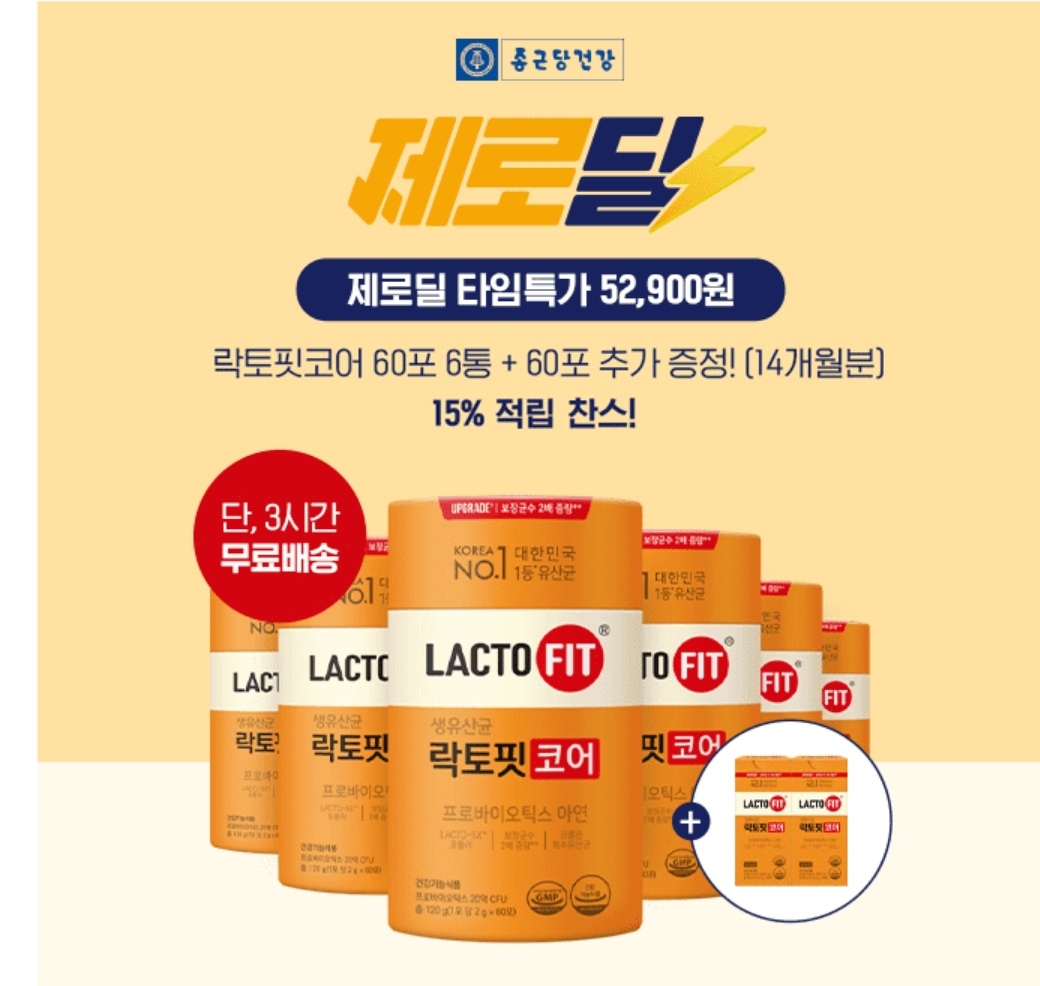 3시간 동안 진행되는 "캐시딜" 타임특가에서 락토핏코어 60포X6통+60포 추가증정(1 4개월분)이 역대급 할인 52,900원+15%적립+무료배송으로 진행됩니다.