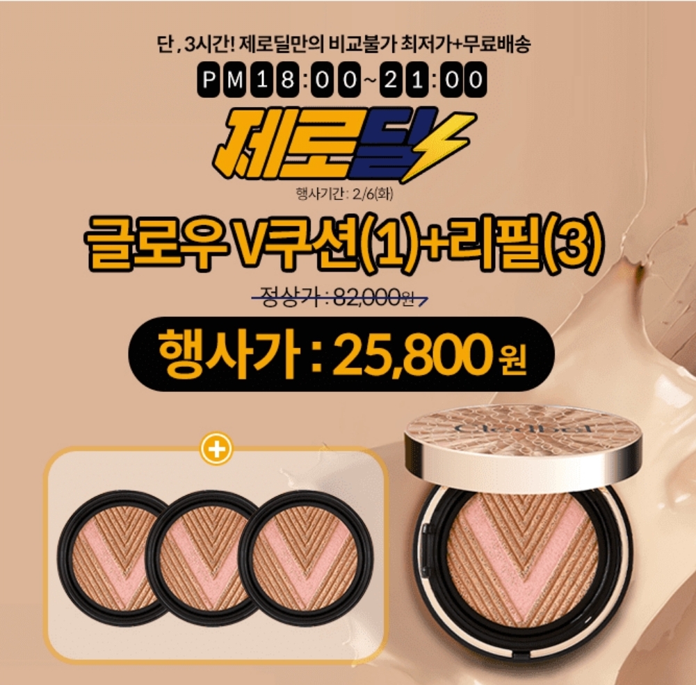 3시간동안 진행되는 캐시딜 타임특가에서 끌레드벨 V쿠션 본품1+리필3구성이 역대급 할인 25,800원+무료배송으로 진행됩니다,