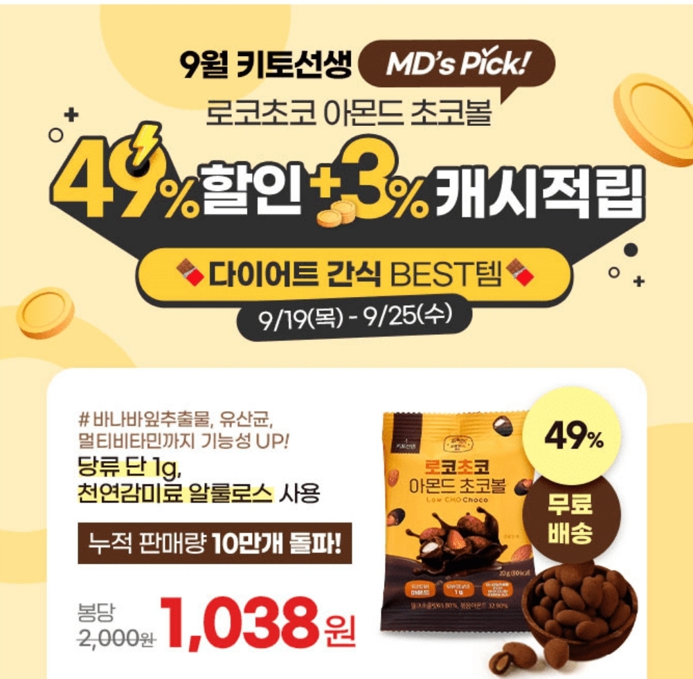 ‣ [단 7일] 9월 키토선생 MD'S PICK! 다이어트 간식 BEST템 로코초코 아몬드 초코볼 49% 할인 & 봉당 1,038 !