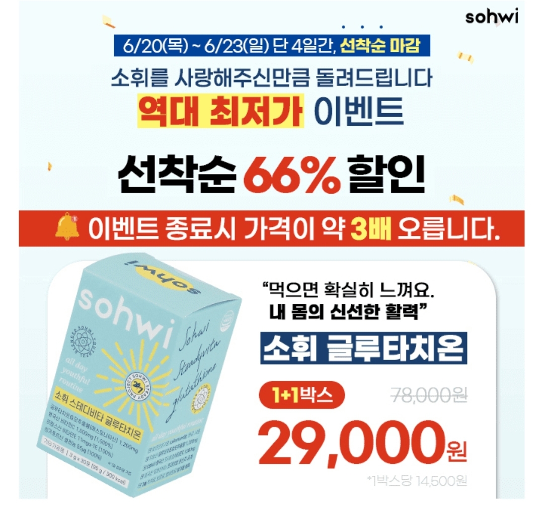 단 하루만 75% 한정혜택 52만포 전량완판! 소휘 글루타치온 분말 왜 다시 찾으시는걸까요? 이 링크에서만 수량소진시 조기종료!