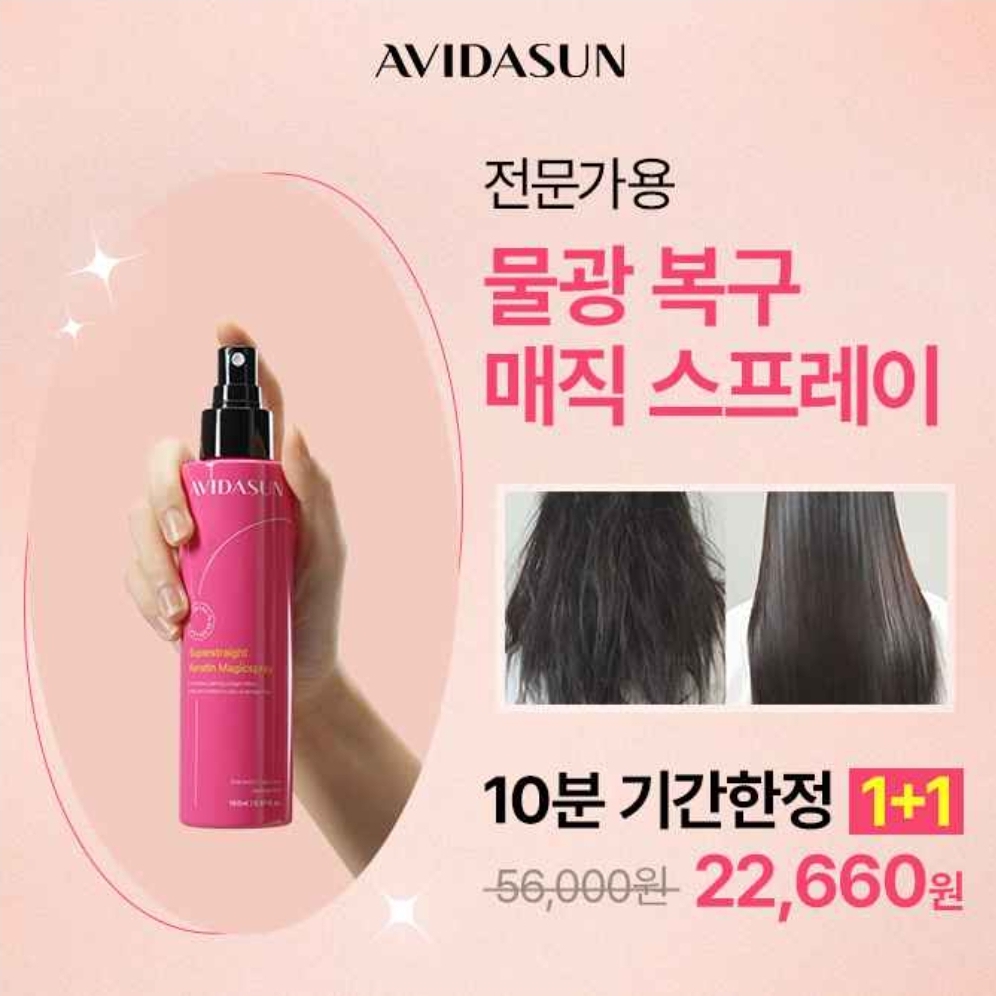 헤어 전문가가 만든 아비다선! 단 7초만에 즉각적인 머리 펴짐 효과가 있으 며, 수분장벽과 영양공급을 해주는 물광 복구 00 스프레이는 잠시후 10시부터 10분간만 1+1 특가로 구매 가능합니다. 00은 무엇일까요?