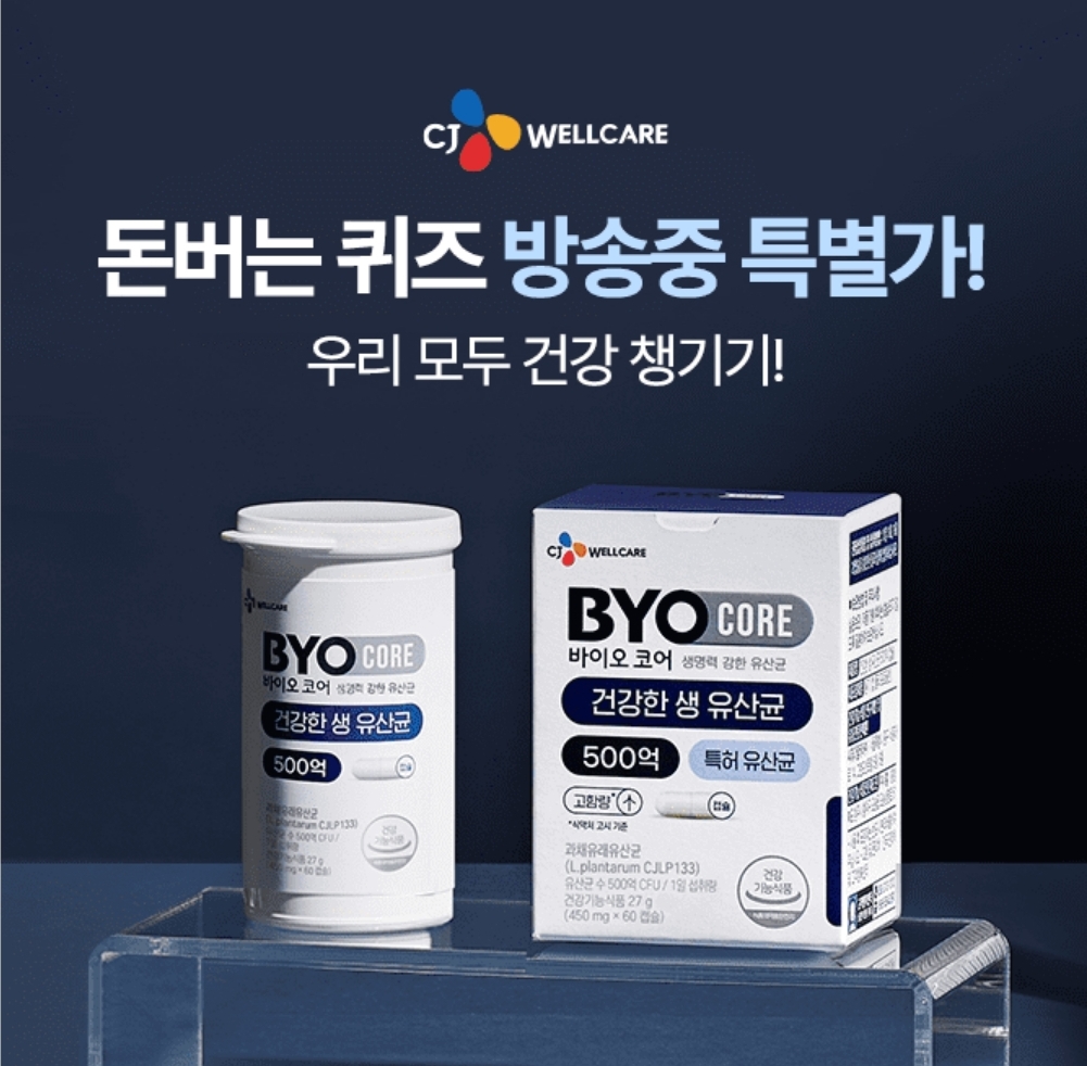 후기가 증명하는 CJ웰케어! CJ웰케어의 바이오코어 건강한 100억 생유산균은 장 속 서식 환경에 맞춘 포물러 000 프리미엄 유산균 입니다. 라이브 중 구매해주시고 주문인증 올려주시고 소통 많이해주시는 분들 추첨하여 돌림판 사은품을 드립니다! 000은 무엇일까요? (힌트: ㄱㅎㄹ)