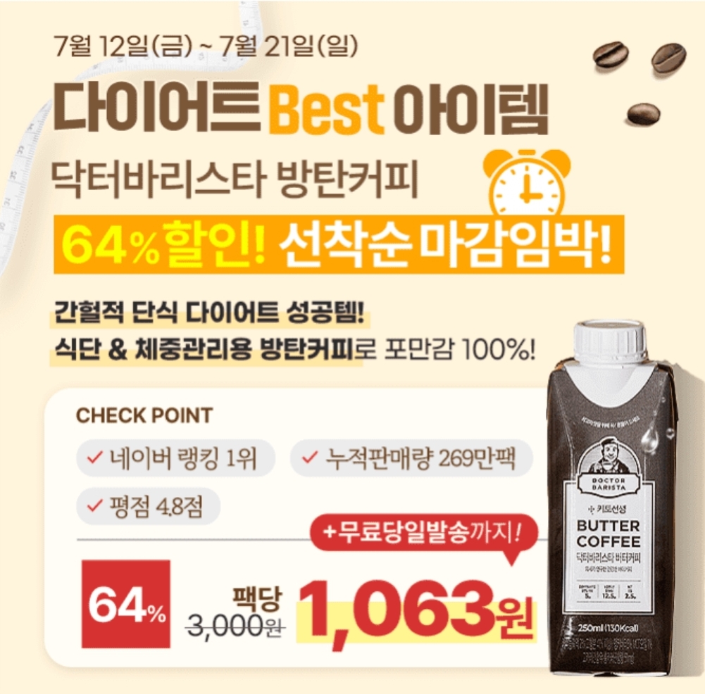 [선착순 마감 임박] 다이어트 BEST 아이템 닥터바리스타 방탄커피! 선착순 64% 할인 & 팩당 1,063원 혜택