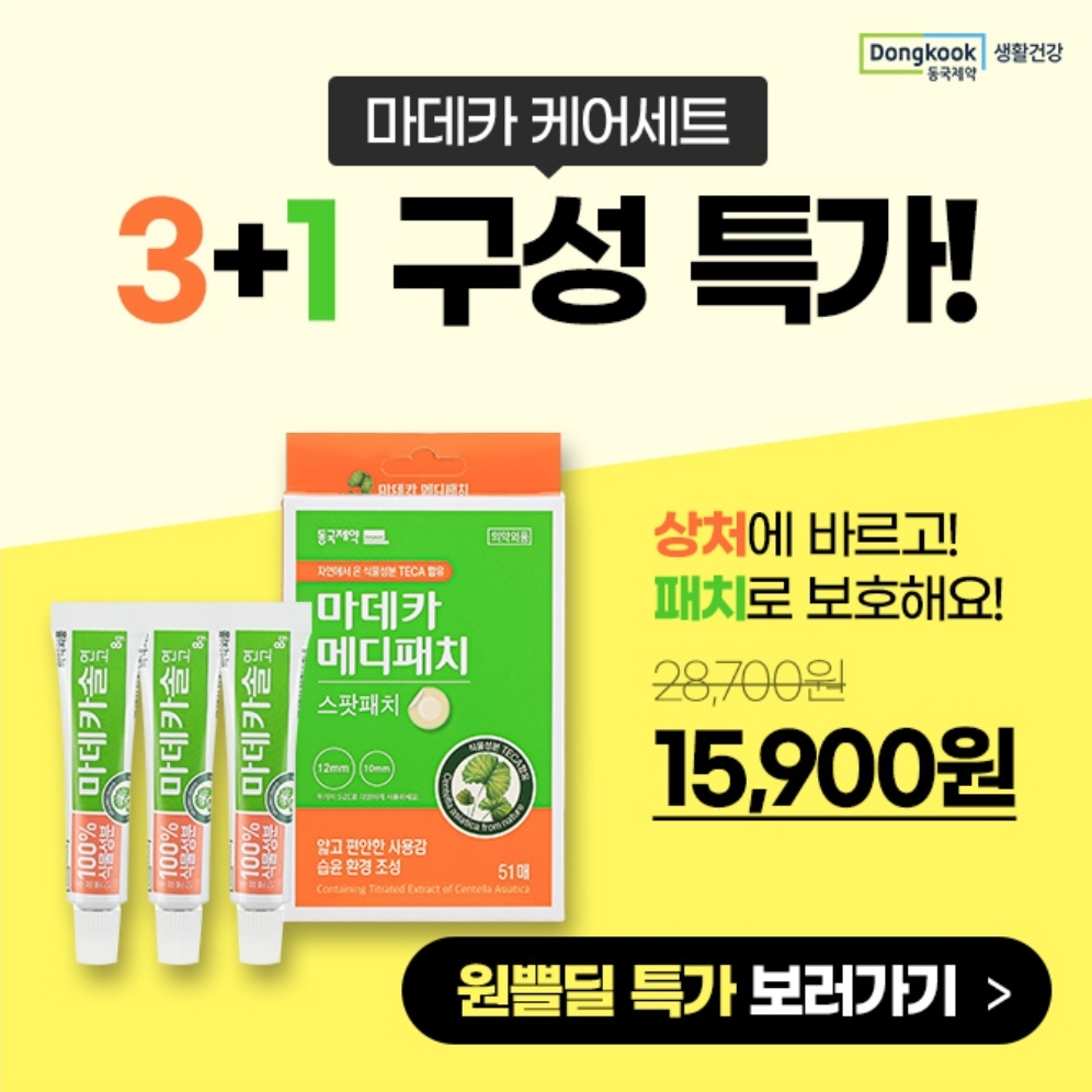 100% 식물 성분으로 無000, 無스테로이드 마데카솔 연고와 티 안 나게 상처를 보호하는 마데카 메디패치! 원쁠딜 특가로 우리집 필수템 쟁여가세요!