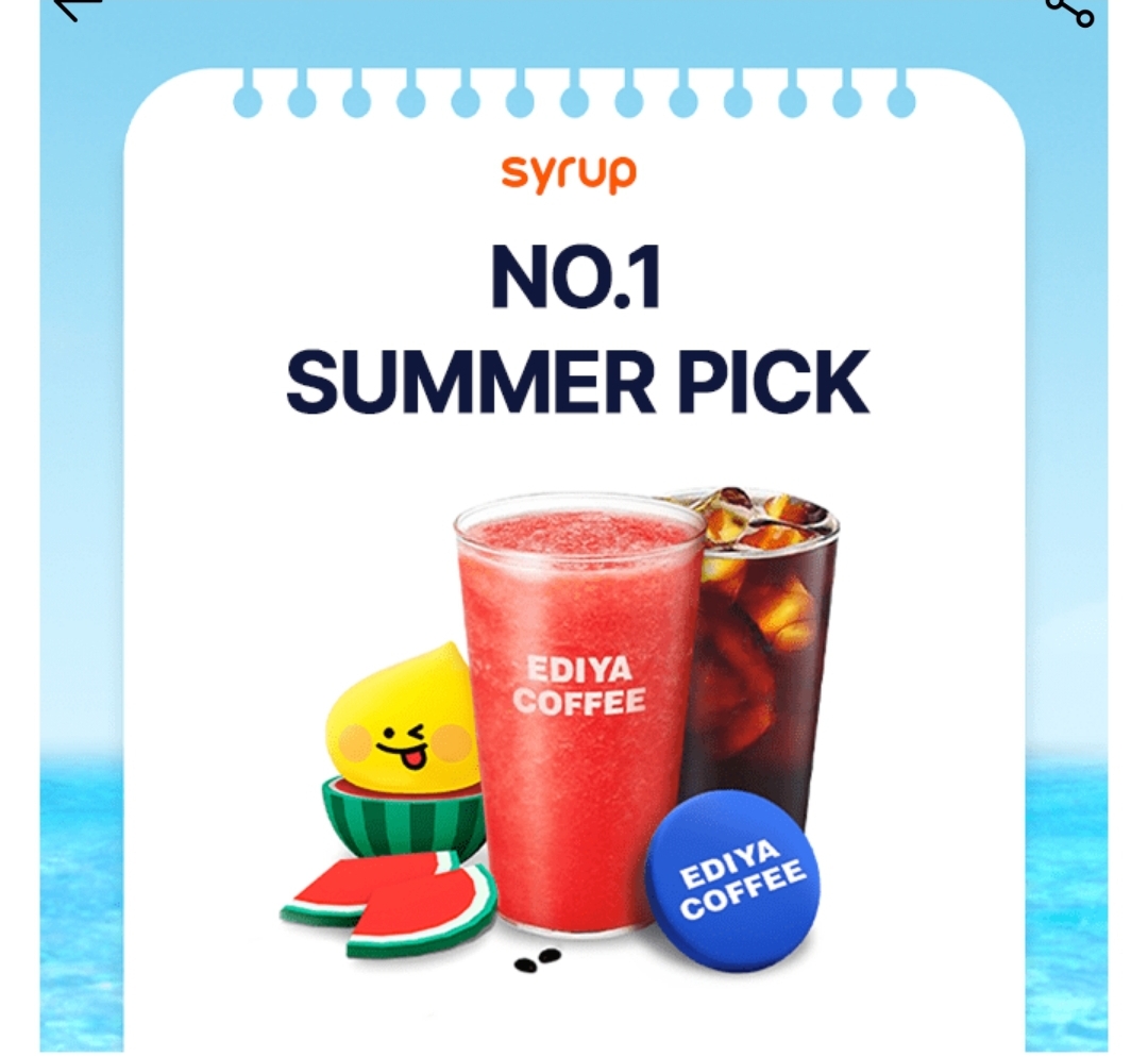 7월 월간 시럽! 뜨거운 여름 N0.1 SUMMER PICK 이디야와 함께 하는 간식 이벤트! 7월의 간식은 생과일 주스 (수박, 000) & 아메리카노! 시원한 음료 50%할인 쿠폰 받아가세요! 참여만 해도 0K캐쉬백을 적립해드리니 꼭 참여해보세요!