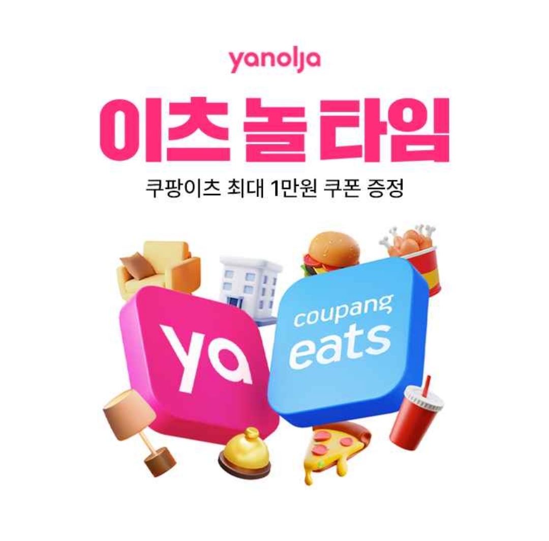 야놀자와 쿠팡이츠의 즐거운 만남 이츠놀타임! 야놀자에서는 매일 오전 11시 ㅇㅇㅇㅇㅇ 10%할인과 중복되는 쿠팡이츠 쿠폰을 드려요.