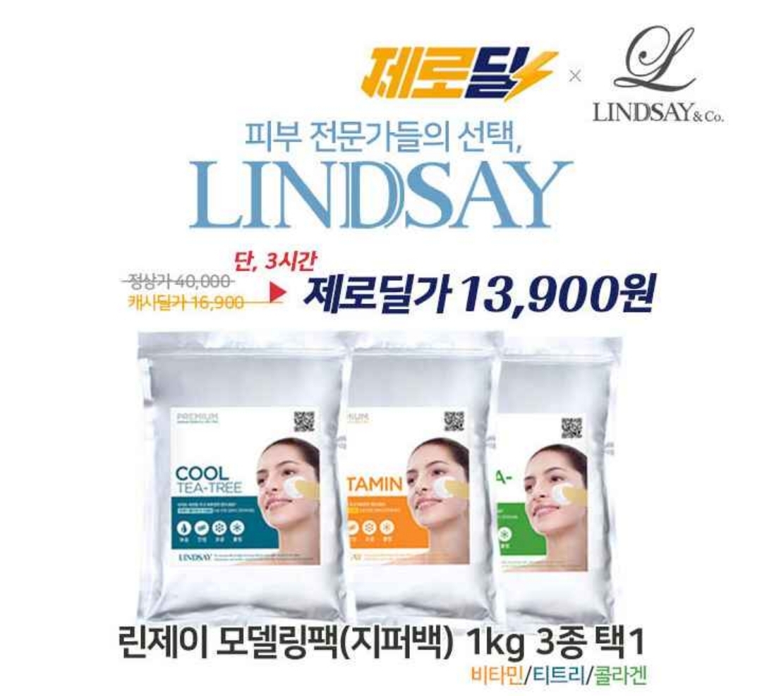 3시간동안 진행되는 캐시딜 타임특가에서 린제이 모델링팩(지퍼백) 1kg(3종 택1)이 역대급 할인 13,900원+무료배송에 진행됩니다. 화학 방부제가 들어가지 않은 린제이 모델링 팩은 콜라겐,ㅇㅇㅇ,비타민 3가지 종류로 구성되어 있습니다. 빈칸에 들어갈 글자는 무엇일까요?(힌트 ㅌㅌㄹ)