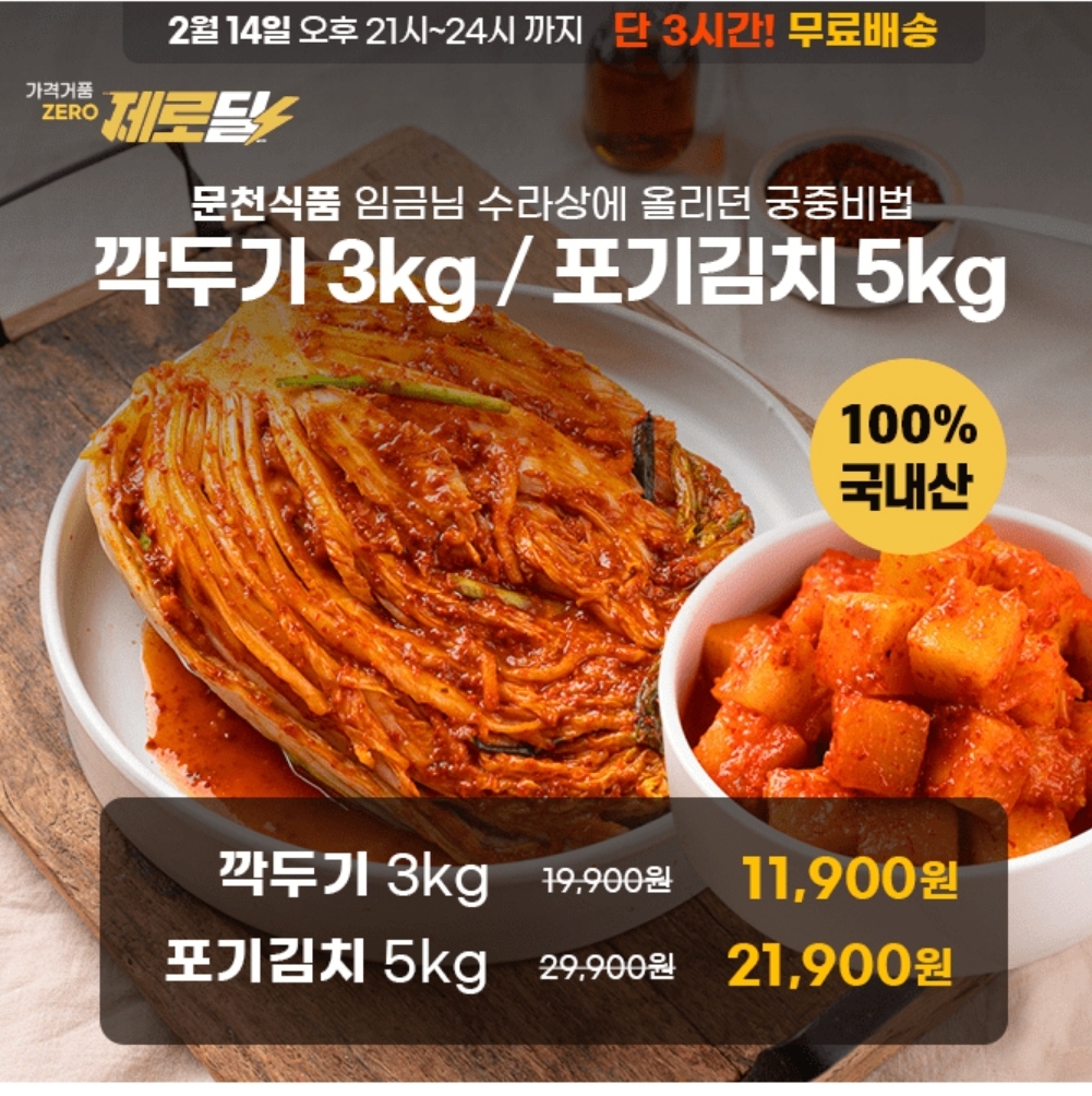 3시간 동안 진행되는 제로딜 타임특가에서 문천식품 임금님의 수라상에 올리면 궁중비법 깍뚜기3kg가 11,900원 무료배송 ㅇㅇ% 할인으로 진행됩니다.빈 칸에 들어갈 숫자는 무엇일까요?