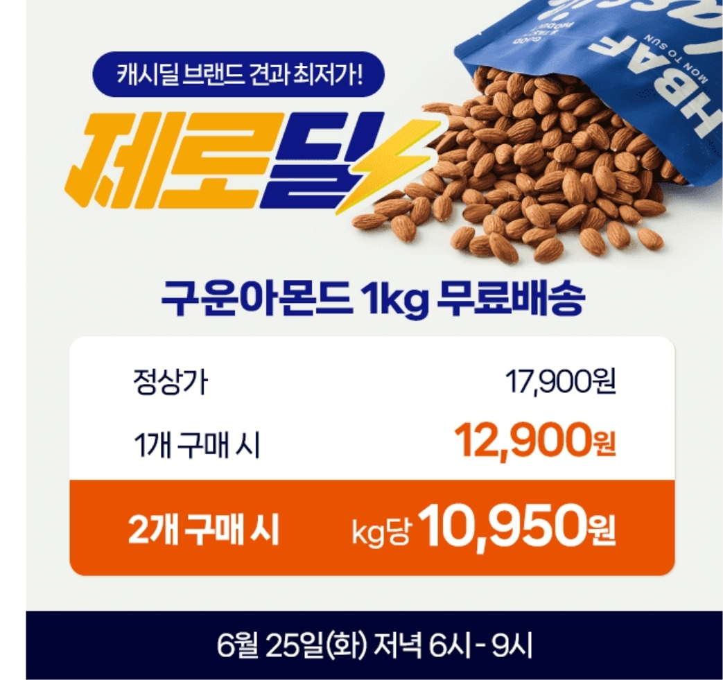 바프 구운 아몬드 1kg, 견과류 원물 전품목 초특가! 캐시워크 돈버는퀴즈정답 6월25일 화요일