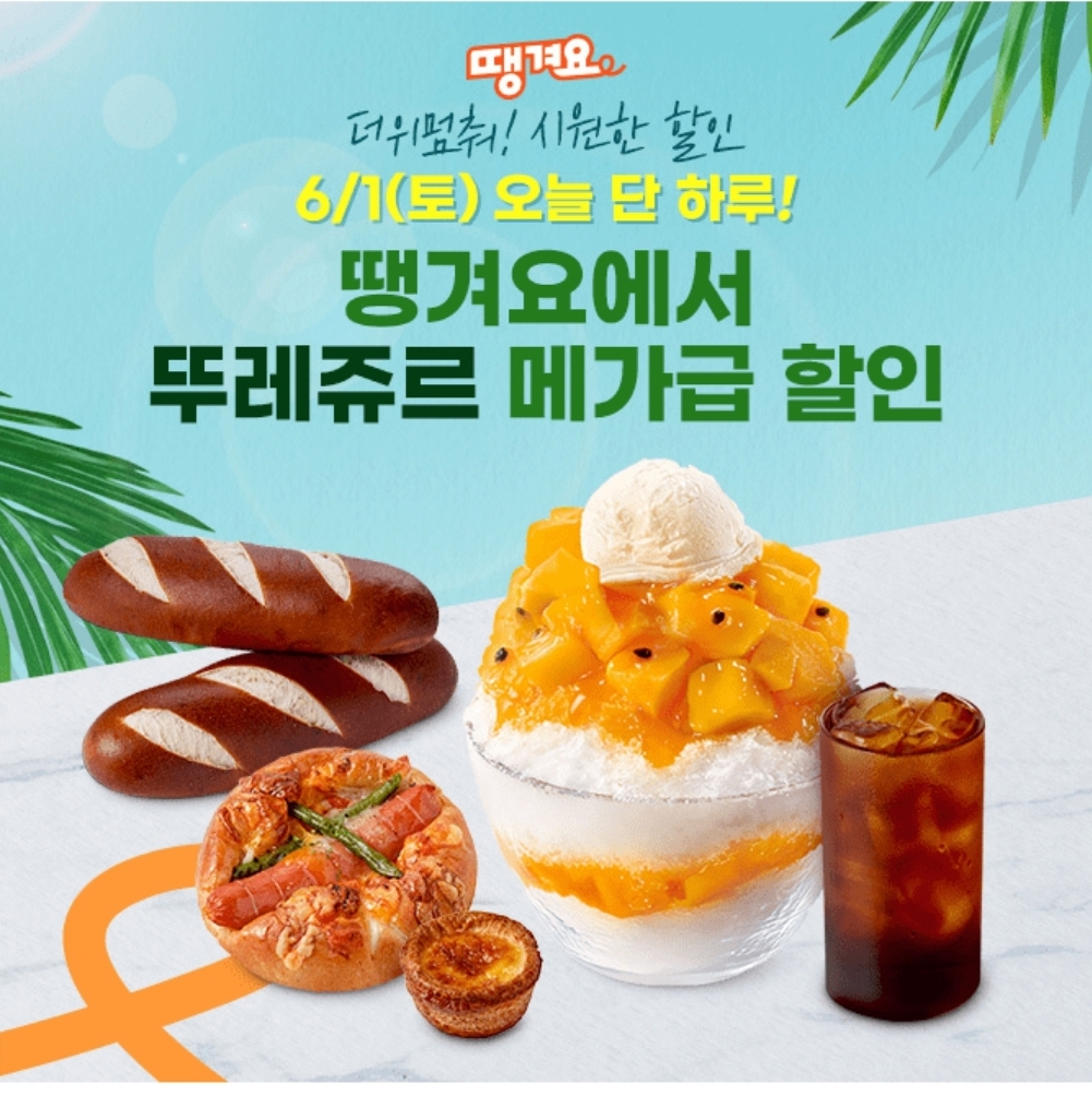 오늘 단 하루 땡겨요에서! 뚜레쥬르 모든 메뉴를 최대 00000원 할인 혜택 받고 주문할 수 있어요!