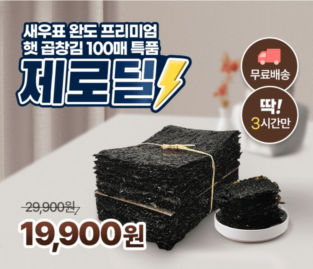 3시간 동안 진행되는 "제로딜" 타임특가에서 "새우표 완도 프리미엄 햇 곱창김 100매 특품400g"가 19,900원 무료배송 00% 할인으로 진행됩니다. 빈 칸에 들어갈 숫자는 무엇일까요?