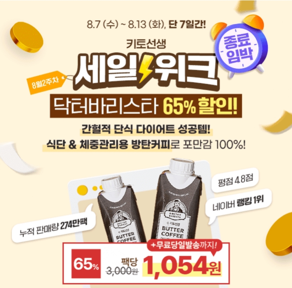 [키토선생 세일위크] 다이어트 성공템 닥터바리스타 방탄커피 65% 할인 & 팩당 1,054원 혜택 종료임박!