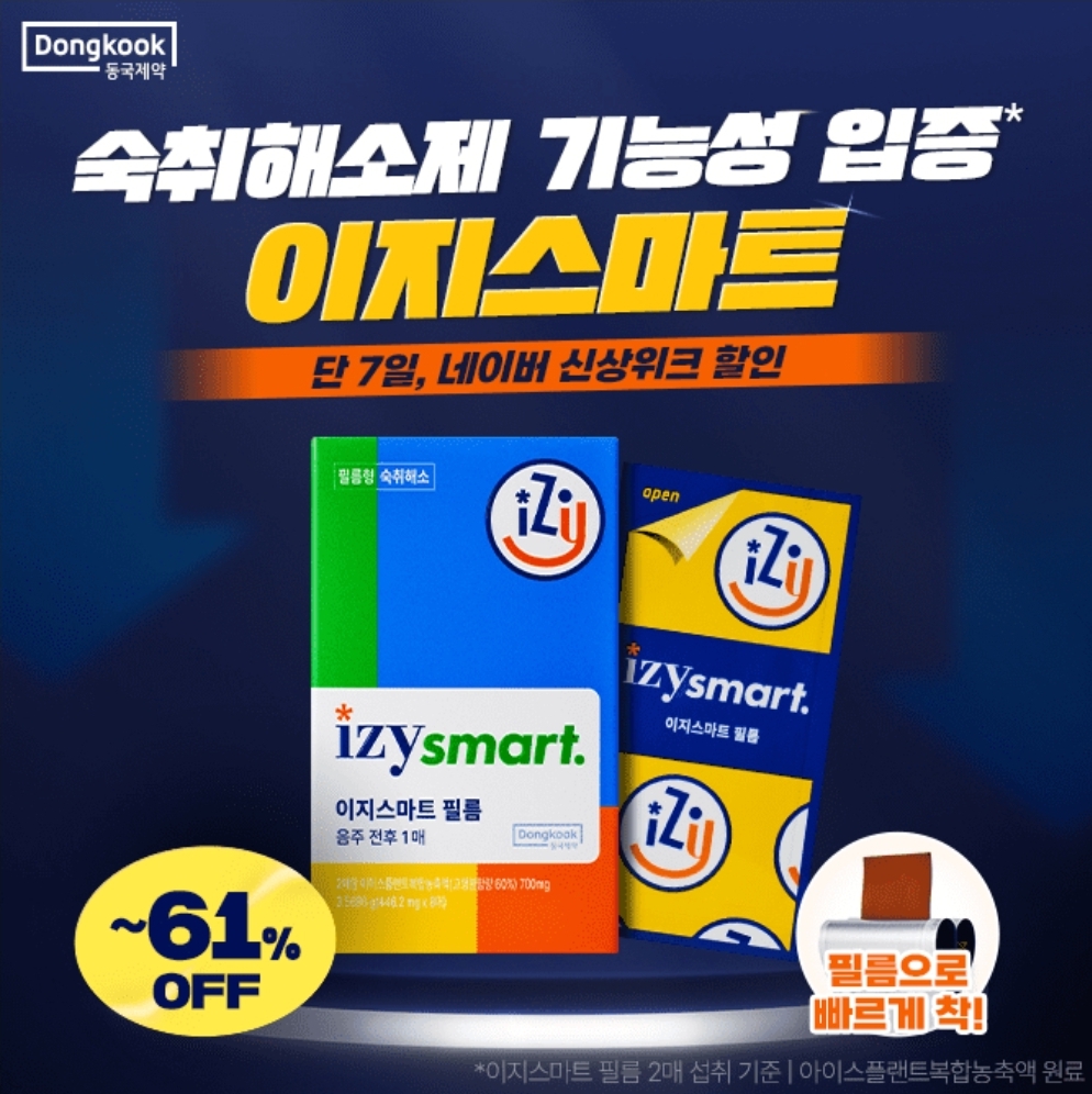 동국제약 시즌 신제품 이지스마트 '숙취해소 필름이 8월 5일 네이버 단독 런칭했습니다~! 숙취로 힘드셨던 분들에게 반가운 제품일텐데 요. 국내최초 '숙취해소' 기능성원료 아이스플 랜트로 만들어졌으며 00제형으로 가볍게 먹 고, 가볍게 갈수 있습니다! 신상위크 기간 구매 시 종아리 안마기기 경품 및 리뷰 경품이벤트 도 준비되어 있습니다. 00은 무엇일까요?