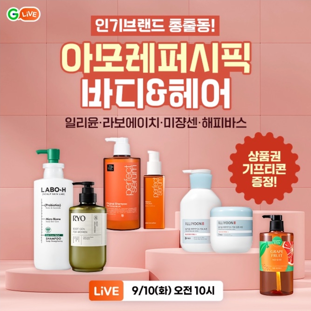 000퍼시픽 바디&헤어 인기브랜드 총.출.동! 일리윤.라보에이치•미쟝센∙해피바스 라방특가+상품권/기프티콘 증정까지!