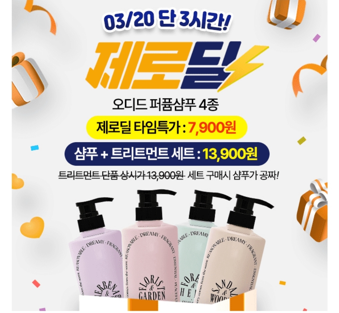 3시간 동안 진행되는 "캐시딜" 타임특가에서 오디드 약산성 퍼퓸 샴푸500ml가 역대급 할인 7,900원+무료배송에 진행됩니다.