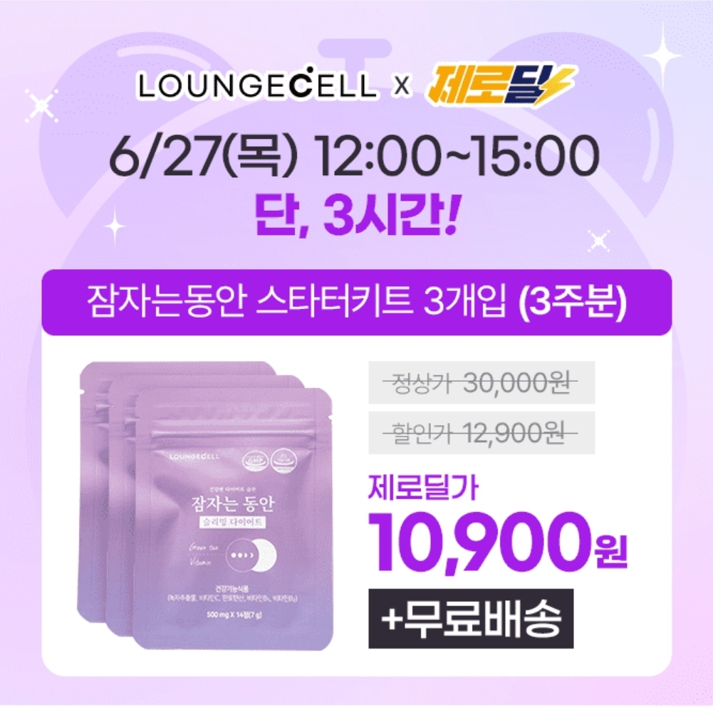 3시간 동안 진행되는 "제로딜' 타임특가에서 "자면서 날씬해지자 잠자는동안 스타터키트 3팩"가 소비자가 30,000원 제로딜가 00000원 무료배송 64% 할인으로 진행됩니다. 빈 칸에 들어갈 숫자는 무엇일까요?