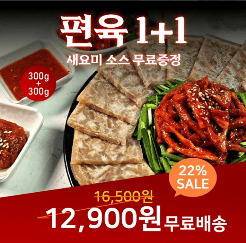 잡내ZERO 삼형제 돼지편육 1+1 (300g+300g) 소비자가 16,500원 특가 00000원 무료배송 22% 할인으로 진행됩니다. 빈 칸에 들어갈 숫자는 무엇일까요?