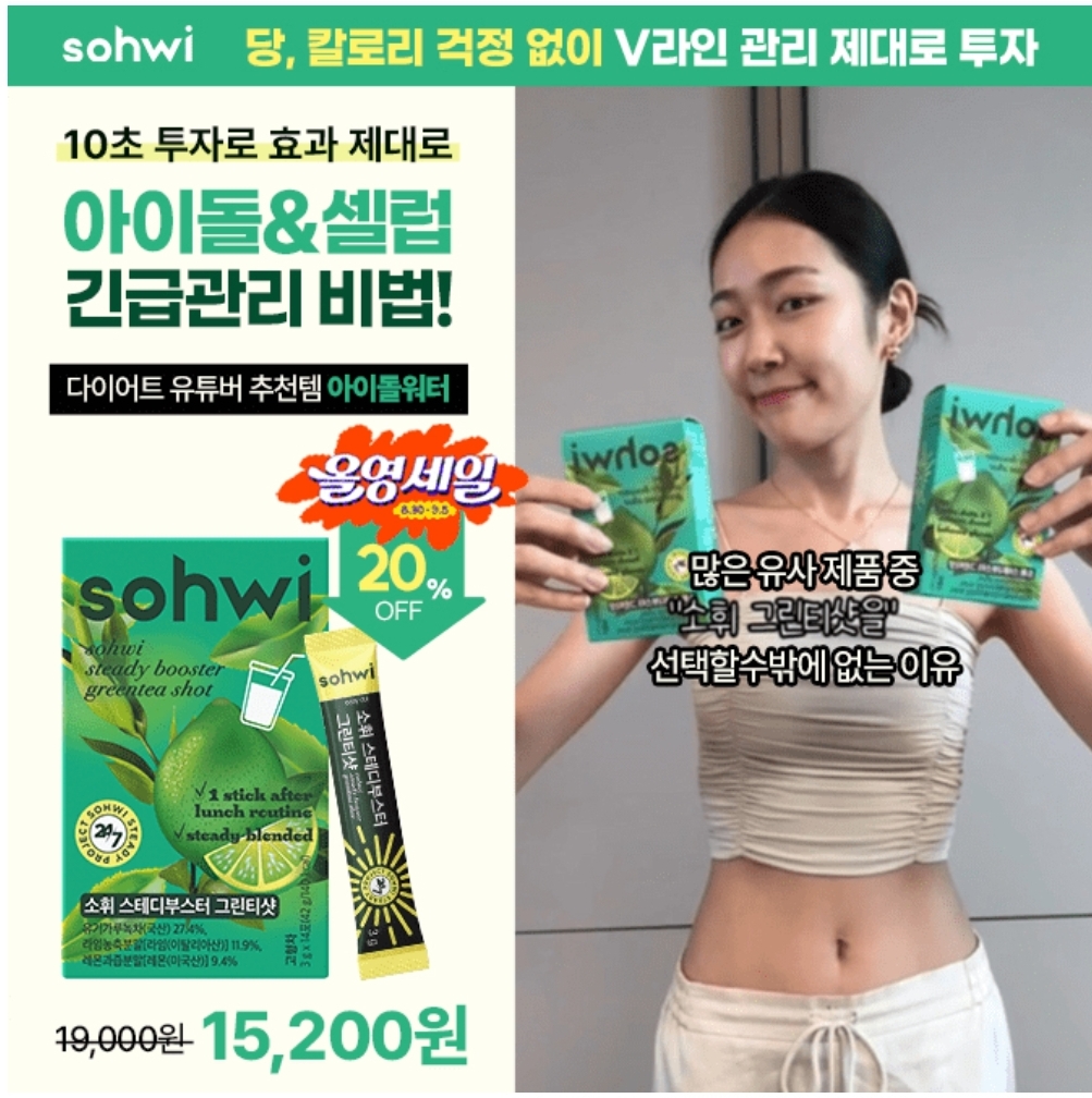 셀럽들의 10분 얼굴라인관리 비법! 소휘 그린 티샷의 핵심은 <000 3단계 시너지 블렌디드 >로 국내산 유기농 녹차와 흡수를 돕는 레몬, 라임 그리고 생강, 계피, 매실, 파인애플까지 단 1포로 섭취 가능합니다. 중요한날 긴급관리 하세요. 여기서 000은?