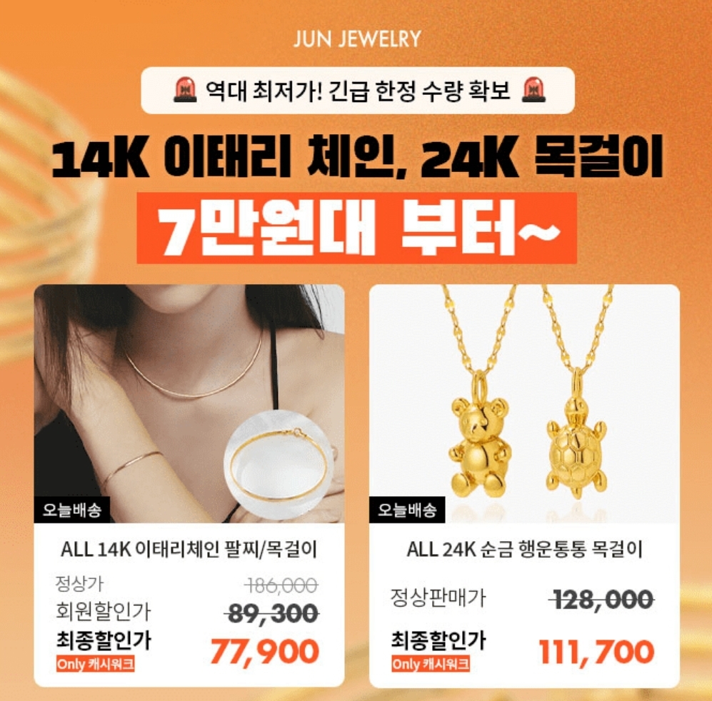 준주얼리 14k 스네이크 체인 7만원대? 딱 오늘만! 캐시워크 돈버는퀴즈정답 2월 5일 월요일