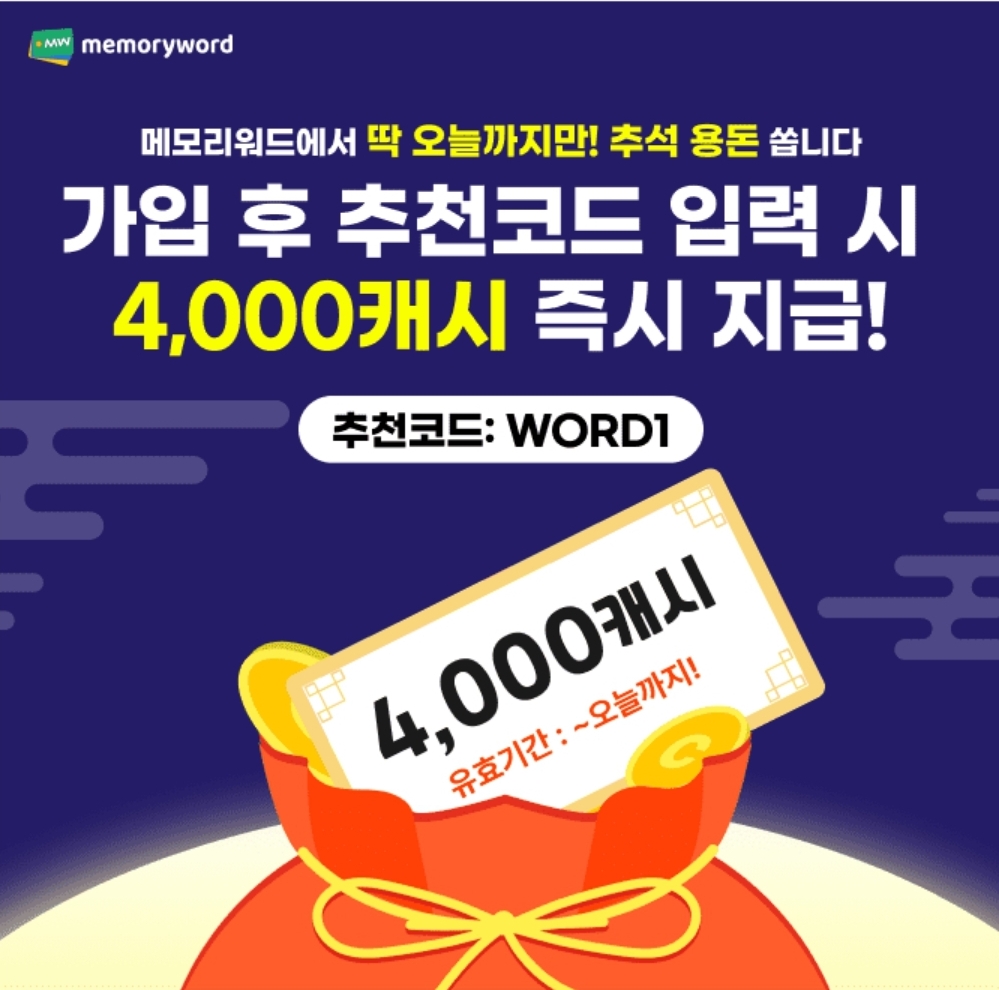 메모리워드에 서 단어 외우고 퀴즈 풀때마다 캐시 적립하며, 00처럼 재미있는 공부 해보세요. 지금 가입하고 추천코드 입력 시추석 용돈 4천캐시를 드려요! (초성 힌트: ㄱㅇ)