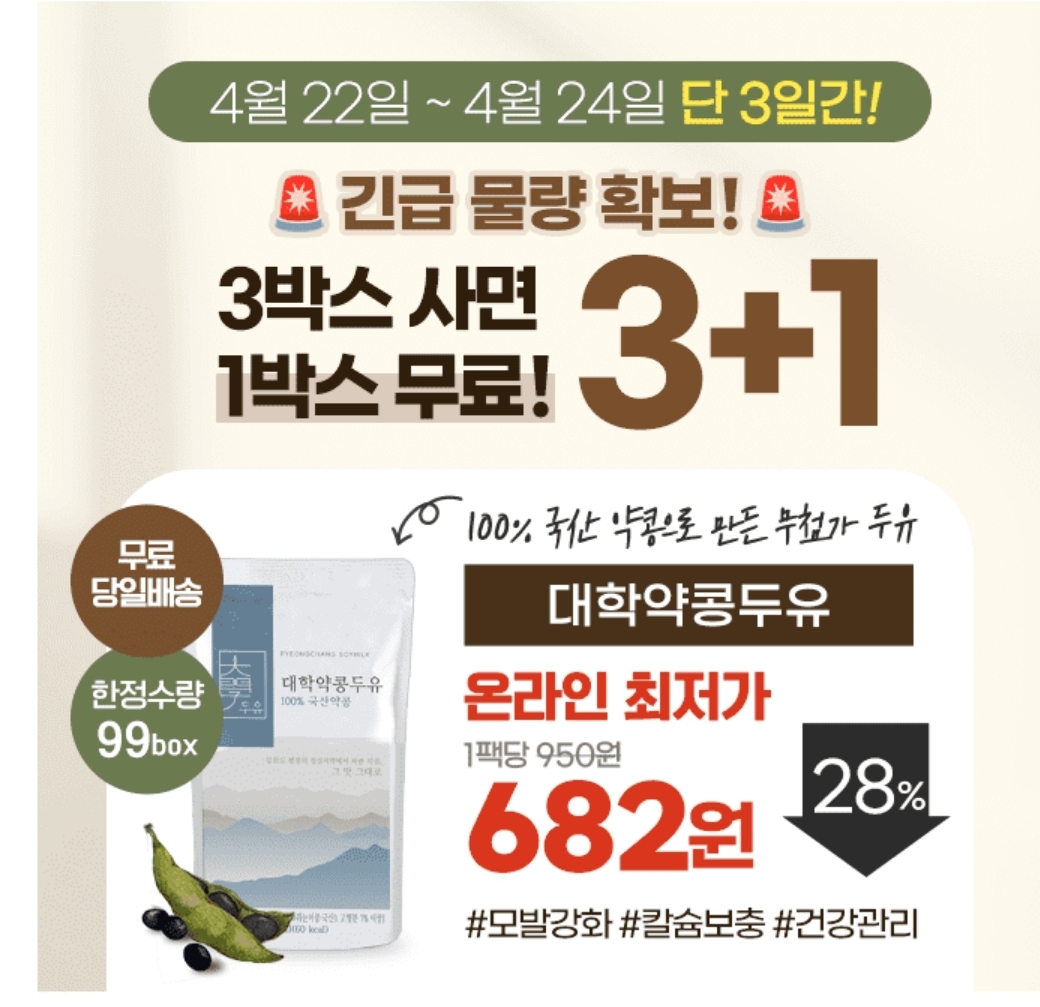 [무료증정] 지금 구매 시 대학약콩두유 1박스 무료 & 온라인최저가 팩당 682원!(*단 99박스 한정)