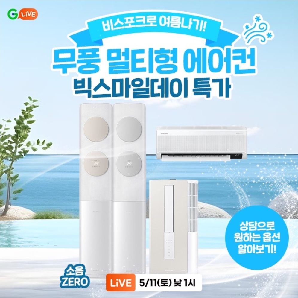 빅스마일데이 특집! 00 에어컨 G LVE 특가 무풍 멀티형 에어컨과 함께 시원~한 여름나기!! 상담으로 원하는 옵션 쏙쑥 골라 내 맘에 쏙 드는에어컨 장만해요!