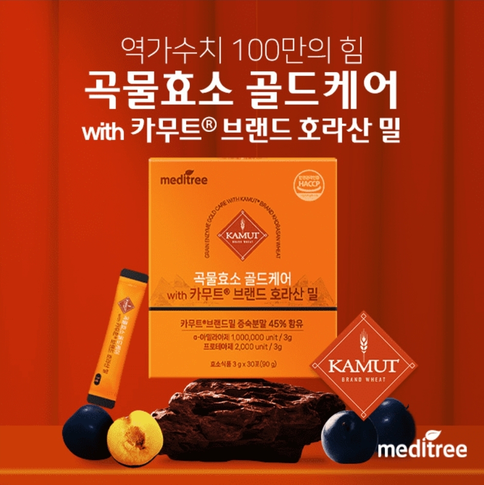 정품 카무트를 사용하고, 역가수치가 무려 100만에 달하는 메디트리 곡물효소 골드케어 with. 카무트R 브랜드 호라산 밀! 5세대 유산 균 틴달화 파라바이오틱스 00종이 함유되어 있습니다. 0에 들어갈 숫자는 무엇일까요?