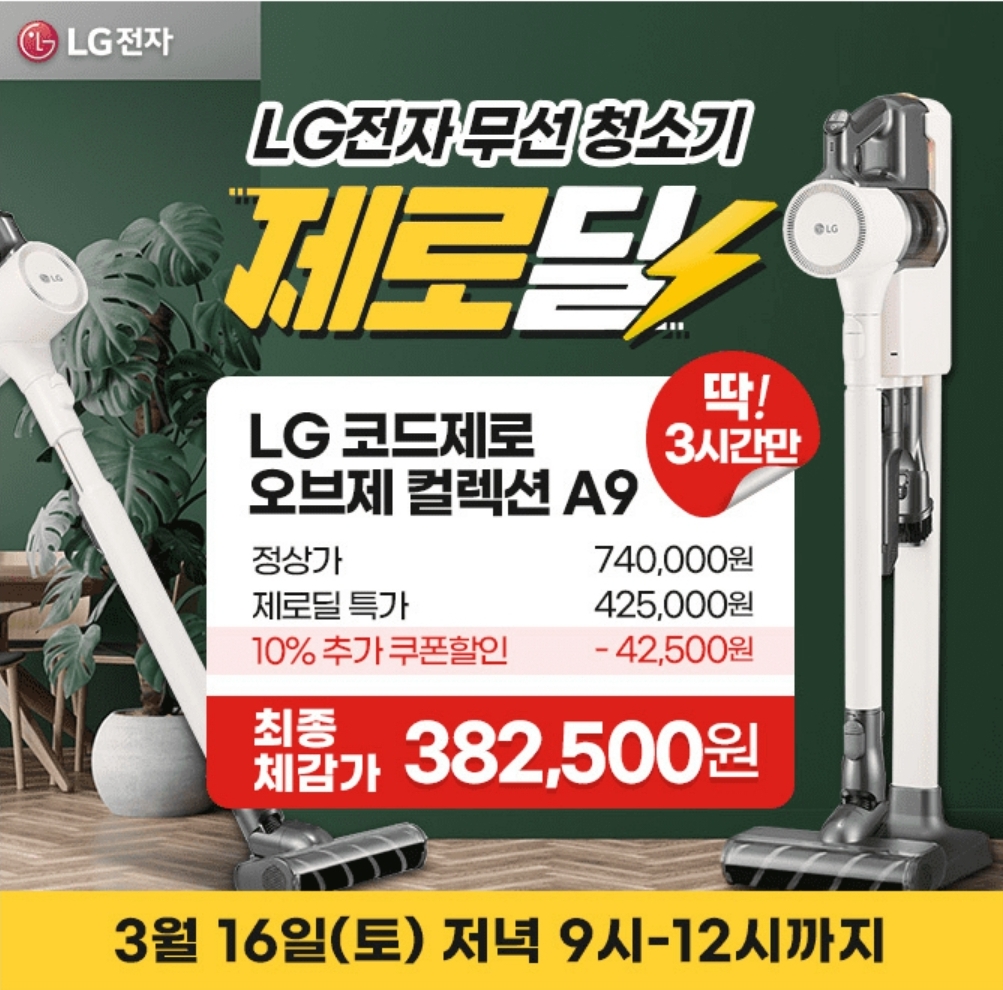 3시간동안 진행되는 제로딜 타임특가에서 LG코드제로 오브제컬렉션 A9 무선청소기 AS9202WD가 소비자가 740,000원. 제로딜가 ㅇㅇㅇㅇㅇㅇ원 무료배송 43% 할인으로 진행됩니다.