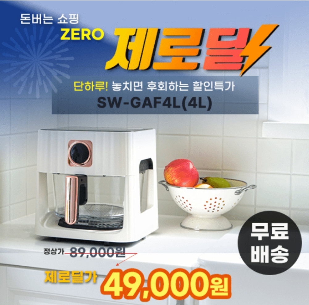 3시간동안 진행하는 제로딜 타임특가에서 겐지아 글라스 에어프라이어 4리터가 소비자가 89,000원 제로딜가 ㅇㅇㅇㅇㅇ원 무료배송 45% 할인으로 진행됩니다.빈칸 들어갈 숫자는 무엇일까요?