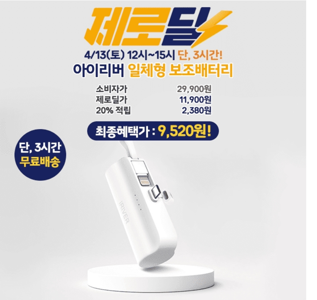3시간동안 진행하는 제로딜 타임특가에서 아이리버 2in1 일체형 미니 보조배터리 5,000mah가 소비자가 29,000원 제로딜가 ㅇㅇㅇㅇㅇ원 무료배송 60% 할인 및 20%적립포인트으로 진행됩니다. 빈칸에 들어갈 숫자는 무엇일까요?
