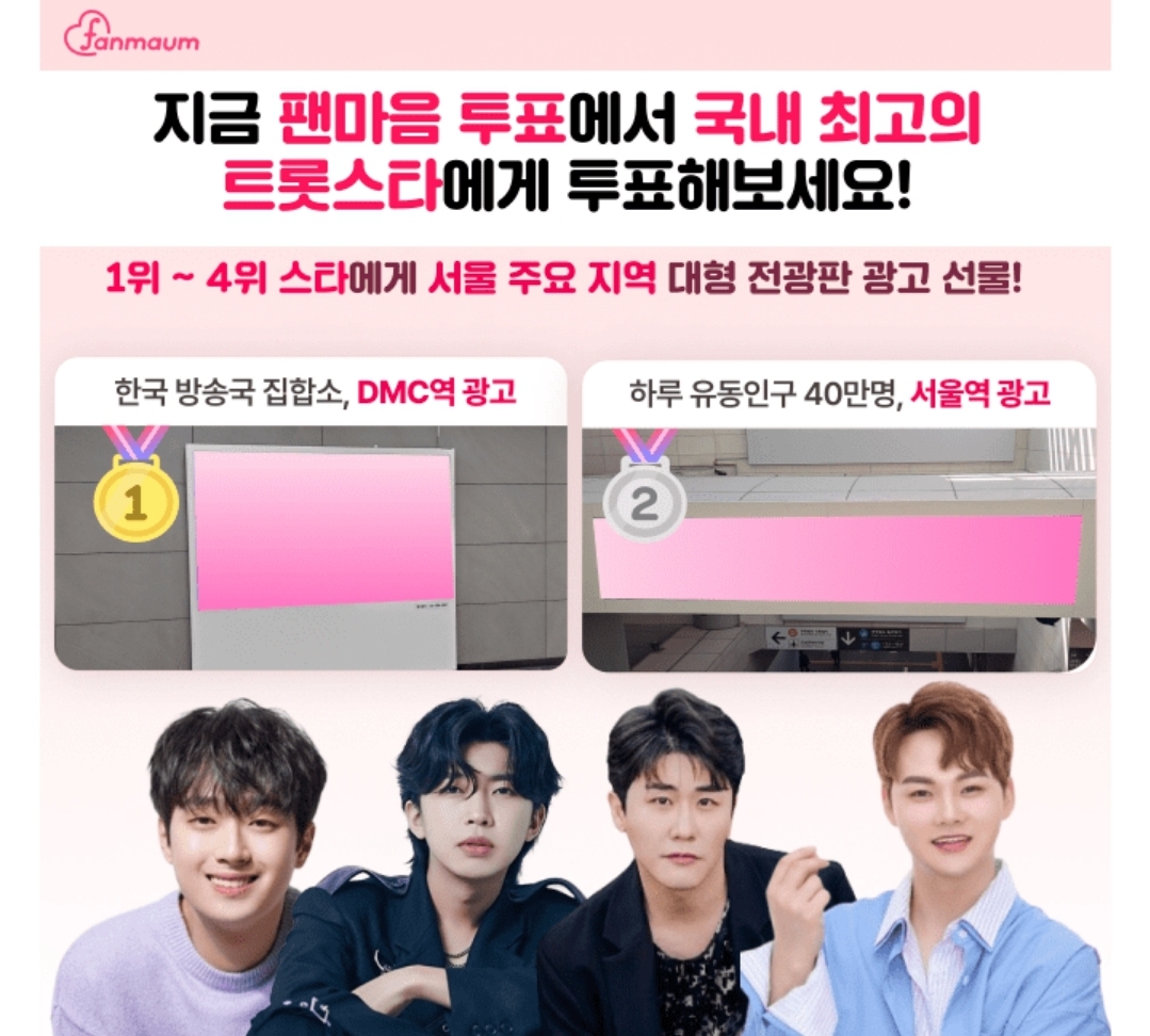 팬마음 트로트 스타 15차 투표에서 2위를 달성한 스타에게는 공항철도의 핵심역사인 000에 LED 광고를 7일동안 선물드려요!