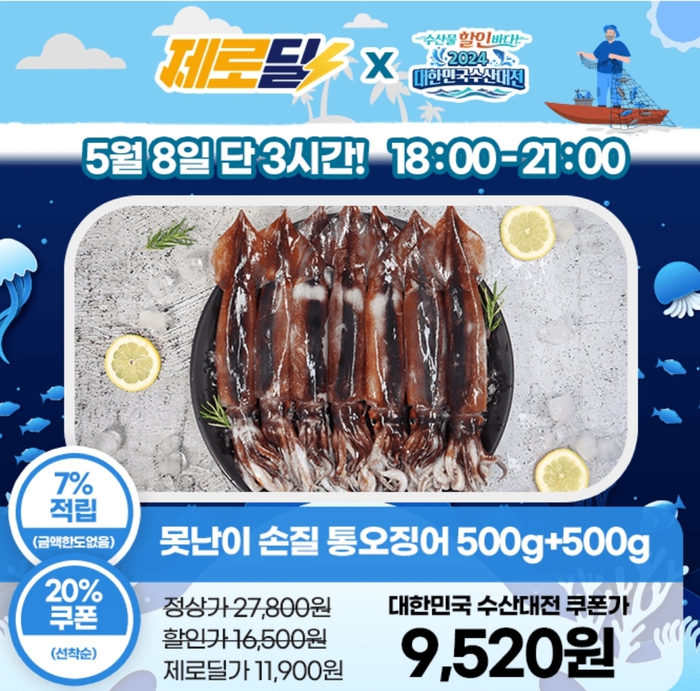 3시간 동안 진행되는 "캐시딜" 타임특가에서 원양산 손질 통오징어 못난이 500g+500g (총8-16미)가 역대급 00% 할인으로 11900원+20%쿠폰+무료배송에 진행됩니다.