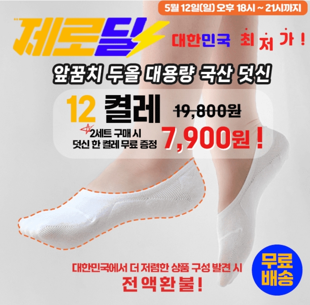 덧신 12컬레 (2개구매시 1개 추가)"가 소비자가 19,800원에서 할인하여 제로딜가 0000원 무료배송 60% 할인으로 진행됩니다.