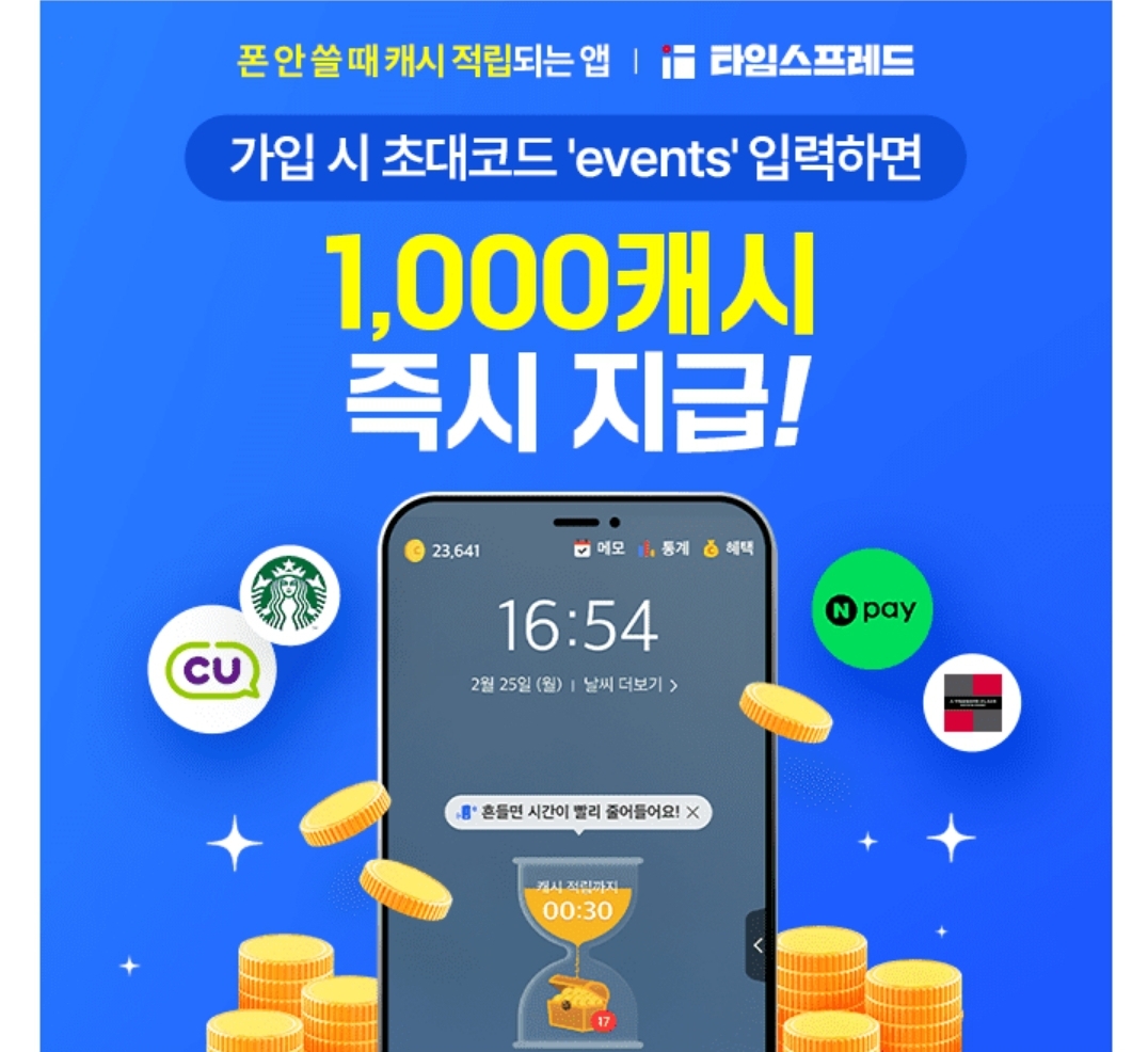 신규 회원을 대상으로 캐시 지급 이벤트를 진행하고 있는 타임스프레드에서는 스마트폰 사용하지 않는 시간에 00를 적립해드려요.