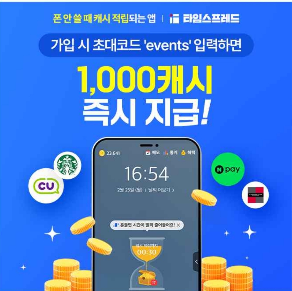 스마트폰 안 쓴 만큼 캐시 적립해주는 앱 타임스프레드에서 핸드폰 000 더 빨리 쌓이는 캐시를 받아보세요. 000은 무엇일까요?