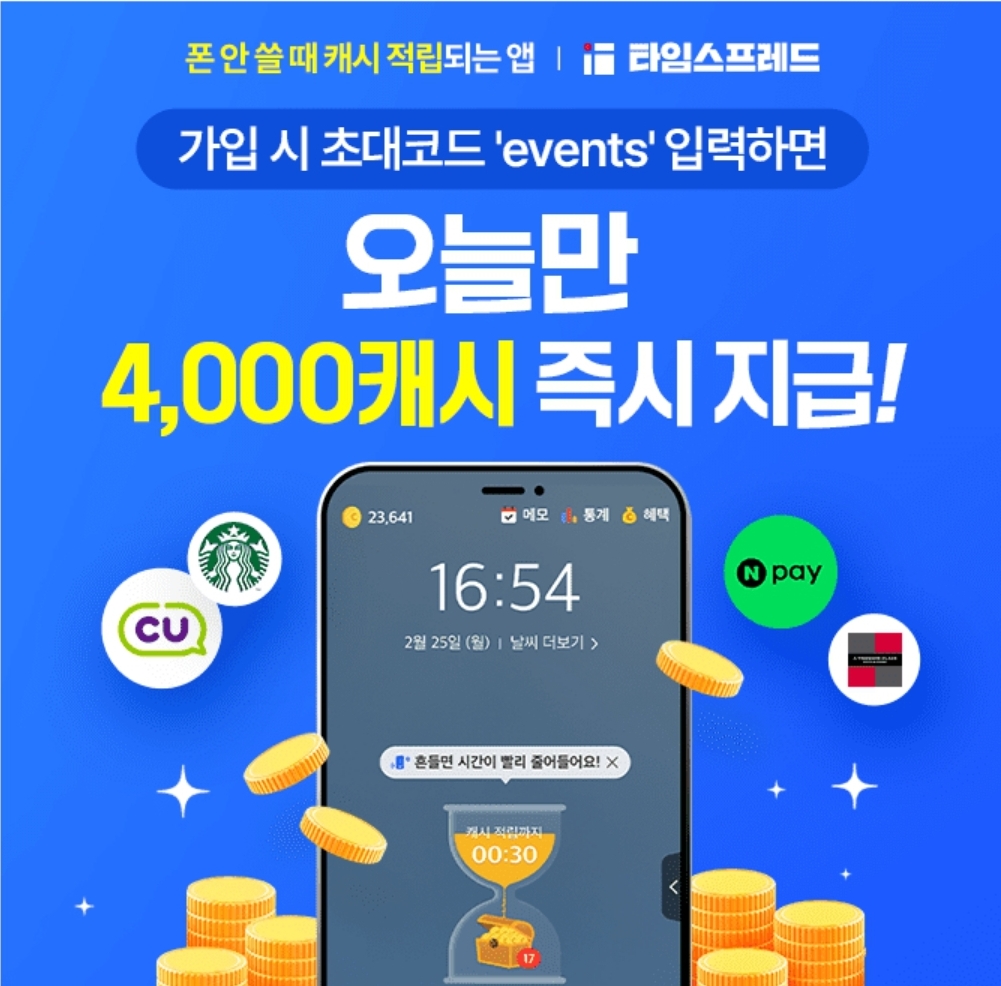 스마트폰 안 쓴 만큼 캐시 적립해주는 앱 타임스프레드에서 핸드폰 000 더 빨리 쌓이는 캐시를 받아보세요. 000은 무엇일까요?